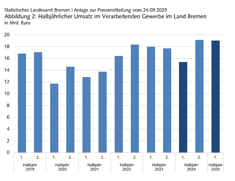 Der Anstieg im Land Bremen im ersten Halbjahr 2025 folgt auf einen Rückgang von 1,0 Prozent im Jahr 2024 (Stand 1. Fortschreibung 2024). Maßgeblich dafür ist ein deutlicher Anstieg der Bruttowertschöpfung im Verarbeitenden Gewerbe. Hier waren die gemeldeten Umsätze wie auch die Wirtschaftsleistung insgesamt im entsprechenden Vorjahreszeitraum auf einem niedrigen Niveau.