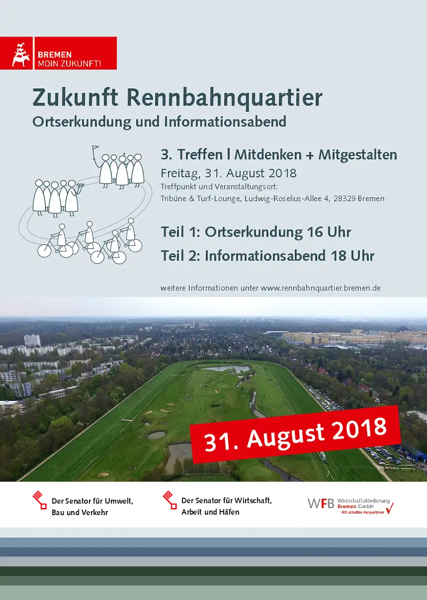 Die Veranstaltung schließt an eine Veranstaltungsreihe aus dem ersten Halbjahr 2018 an, die sich unter großer öffentlicher Beteiligung mit dem Umfeld des Rennbahnareals auseinandergesetzt hatte. Die Dokumentationen sowie die Ergebnisse der „stadtstrukturellen Analyse“ stehen auf der Homepage der Stadtgemeinde Bremen unter www.rennbahnquartier.bremen.de zum Download zur Verfügung.