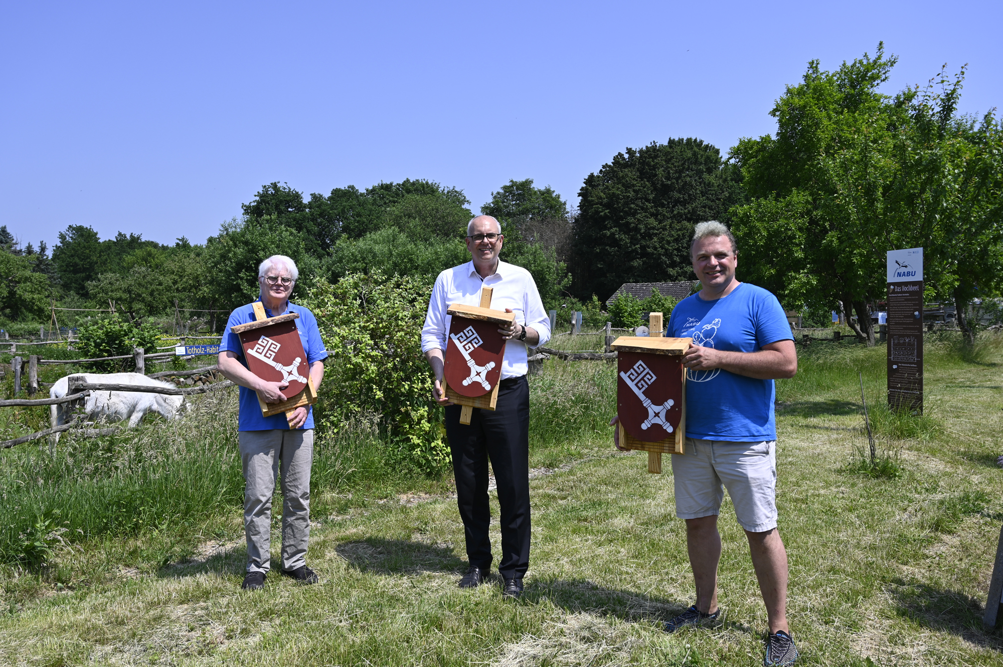 Der NABU engagiert sich für den Artenreichtum und mit Fledermausbrutkästen sollen die nachtaktiven Tiere neue Brutmöglichkeiten erhalten. Der "Fledikasten Nr. 1" mit Bremer Schlüssel, den der Bürgermeister vom NABU überreicht bekam, wird in Zukunft seinen Platz an der Maschinenhalle auf dem Lagerplatz Höpkens Ruh bekommen.