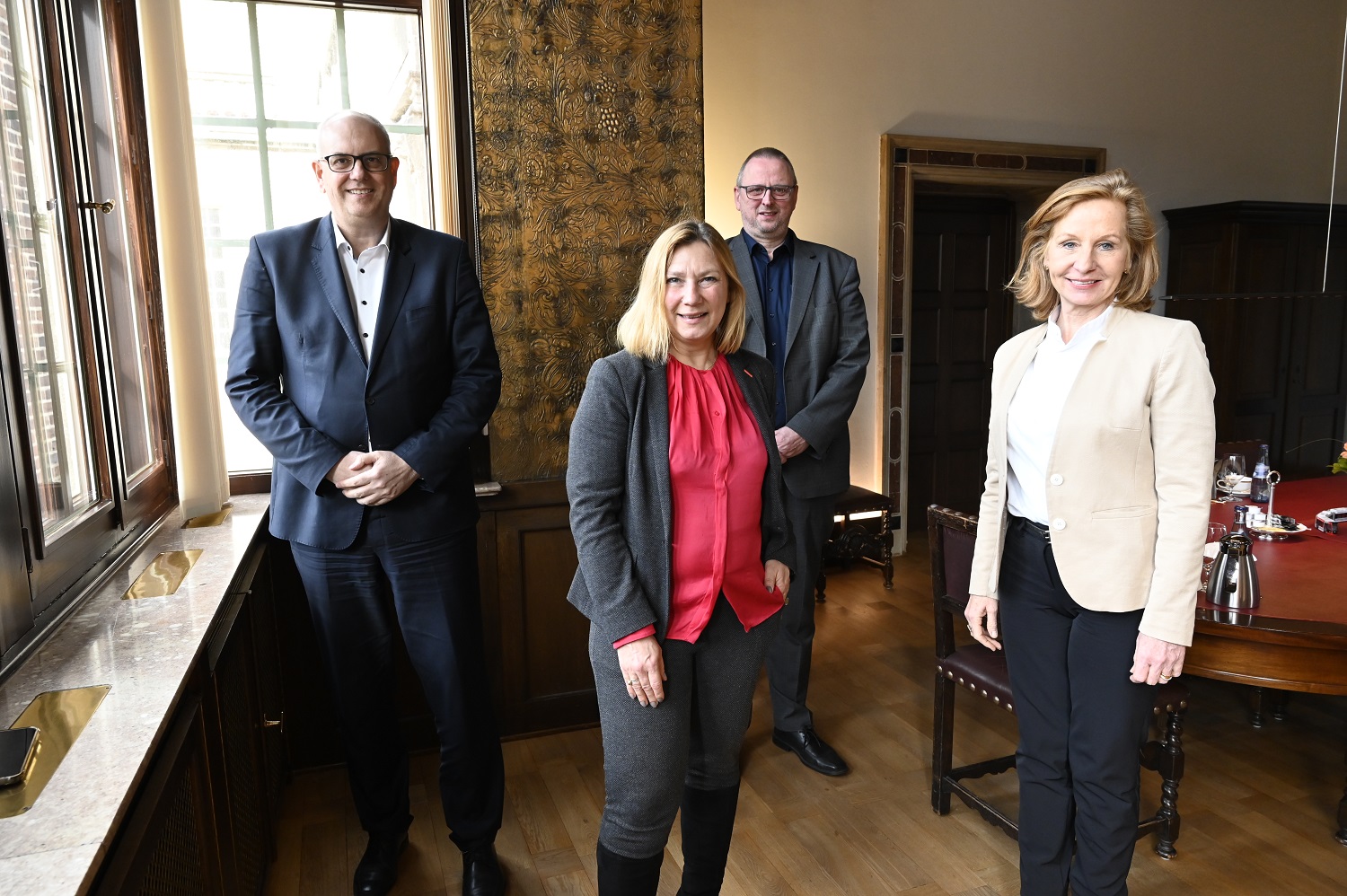 Antrittsbesuch der neuen ARD-Vorsitzenden im Rathaus (v.l.n.r.): Bürgermeister Dr. Andreas Bovenschulte, Radio-Bremen-Intendantin Dr. Yvette Gerner, Staatsrat Dr. Olaf Joachim, ARD-Vorsitzende und Intendantin des Rundfunks Berlin-Brandenburg (rbb) Patricia Schlesinger. Foto: Senatskanzlei