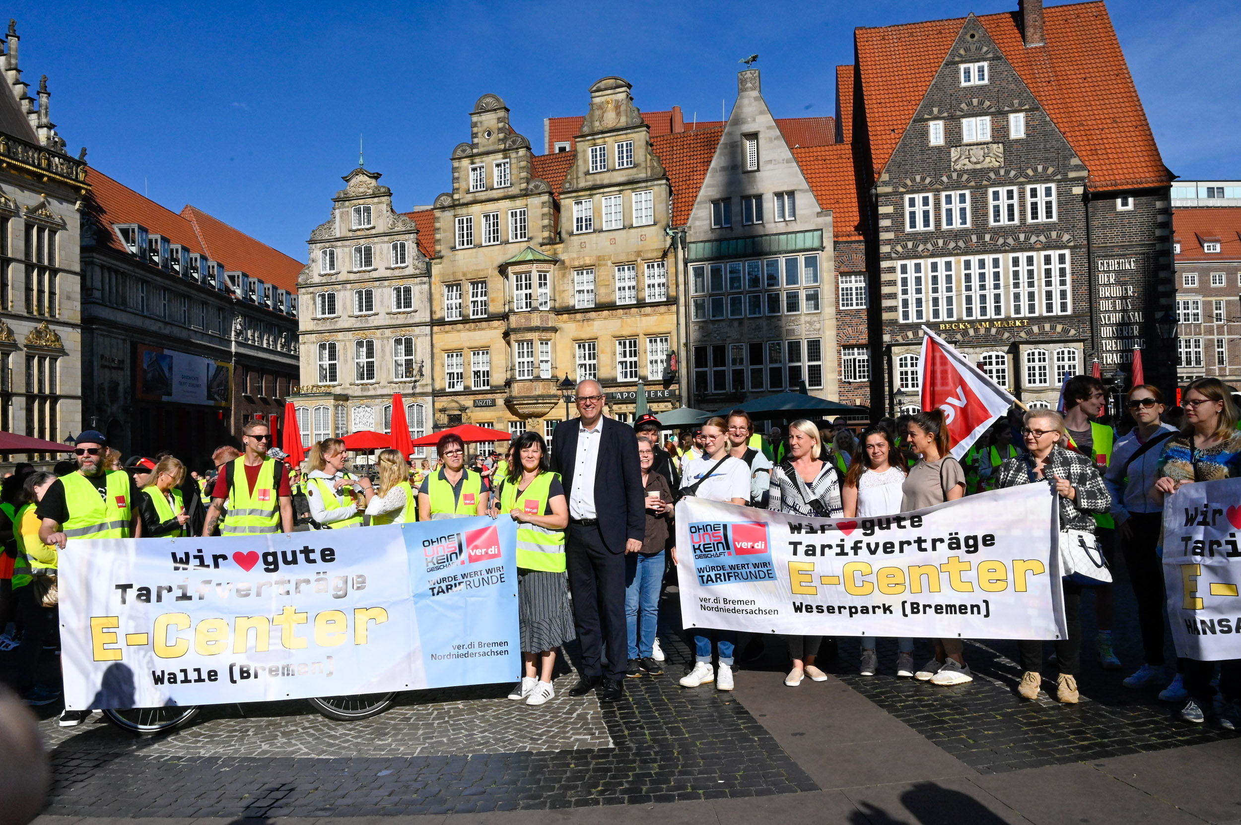 Bei einer Kundgebung mit rund 450 Beschäftigten des Einzelhandels auf dem Bremer Marktplatz hat Bürgermeister Andreas Bovenschulte heute (5. September 2023) seine Solidarität mit den Forderungen der Arbeitnehmerinnen und Arbeitnehmern für faire Arbeitsbedingungen, gerechte Löhne und eine Allgemeinverbindlichkeit der Tarifverträge ausgedrückt.