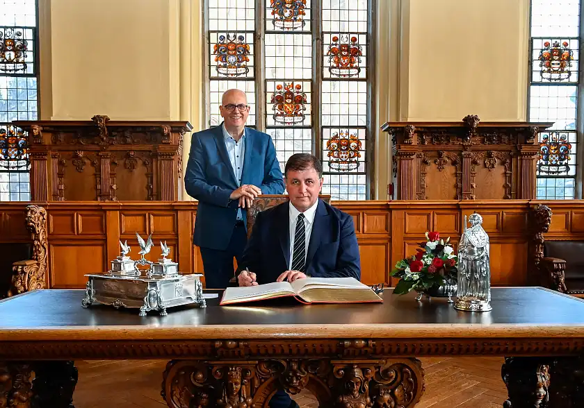 15.10.2024Bürgermeister Andreas Bovenschulte hat heute (15. Oktober 2024) eine Delegation aus Bremens türkischer Partnerstadt Izmir empfangen, die von Bürgermeister Cemil Tugay angeführt wird. Tugay trug sich dabei auch in das Goldene Buch ein.