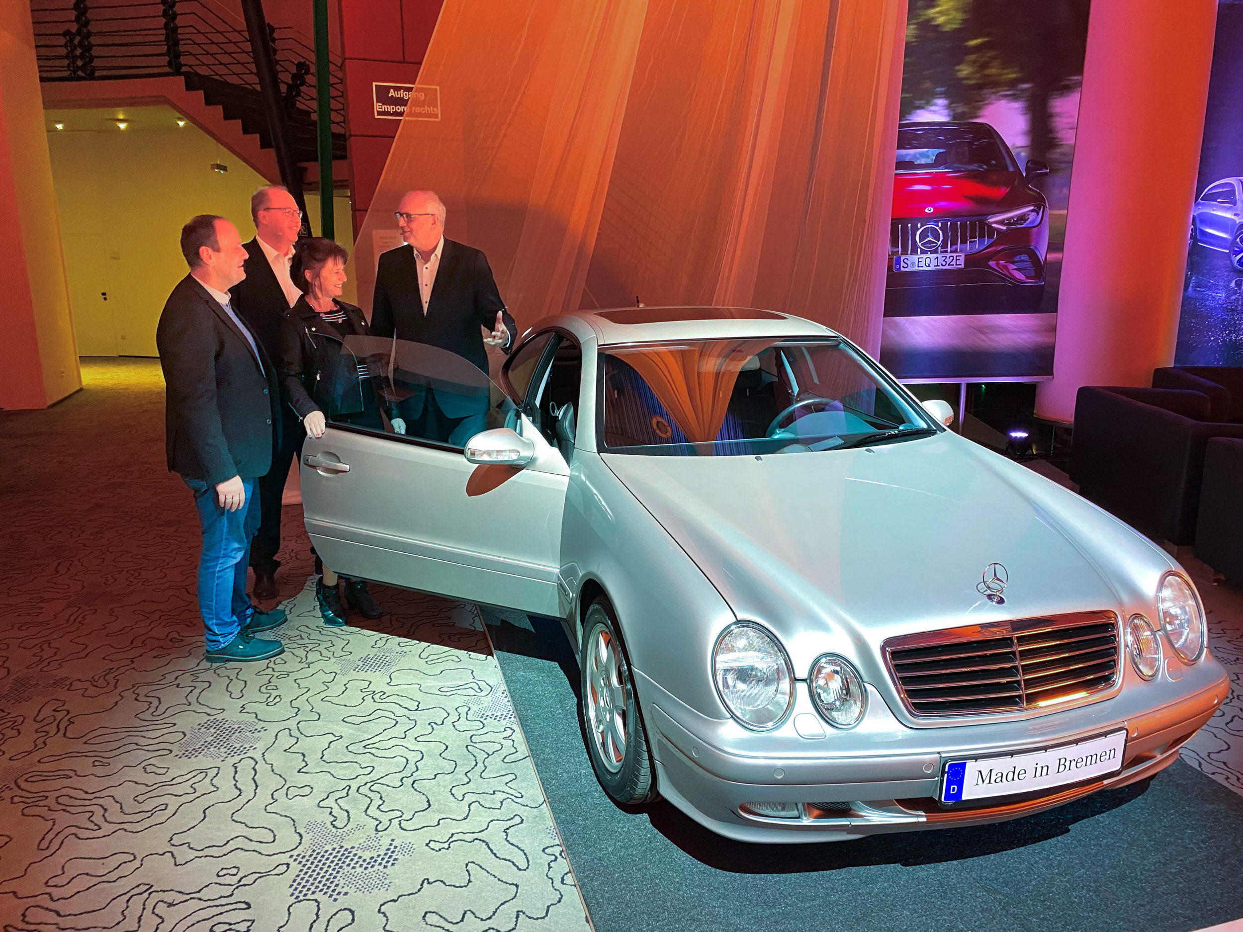 90 Jahre Mercedes-Zugehörigkeit im Gespräch mit dem Bürgermeister (von links): Michael Kante (40-jähriges Jubiläum), Jens Brunklaus (25-jähriges Jubiläum) und Susanne Hornig (25-jähriges Jubiläum) mit Bürgermeister Andreas Bovenschulte neben einem im Jahr 2000 in Bremen vom Band gelaufenen Mercedes CLK Coupé. Foto: Mercedes-Benz Werk Bremen