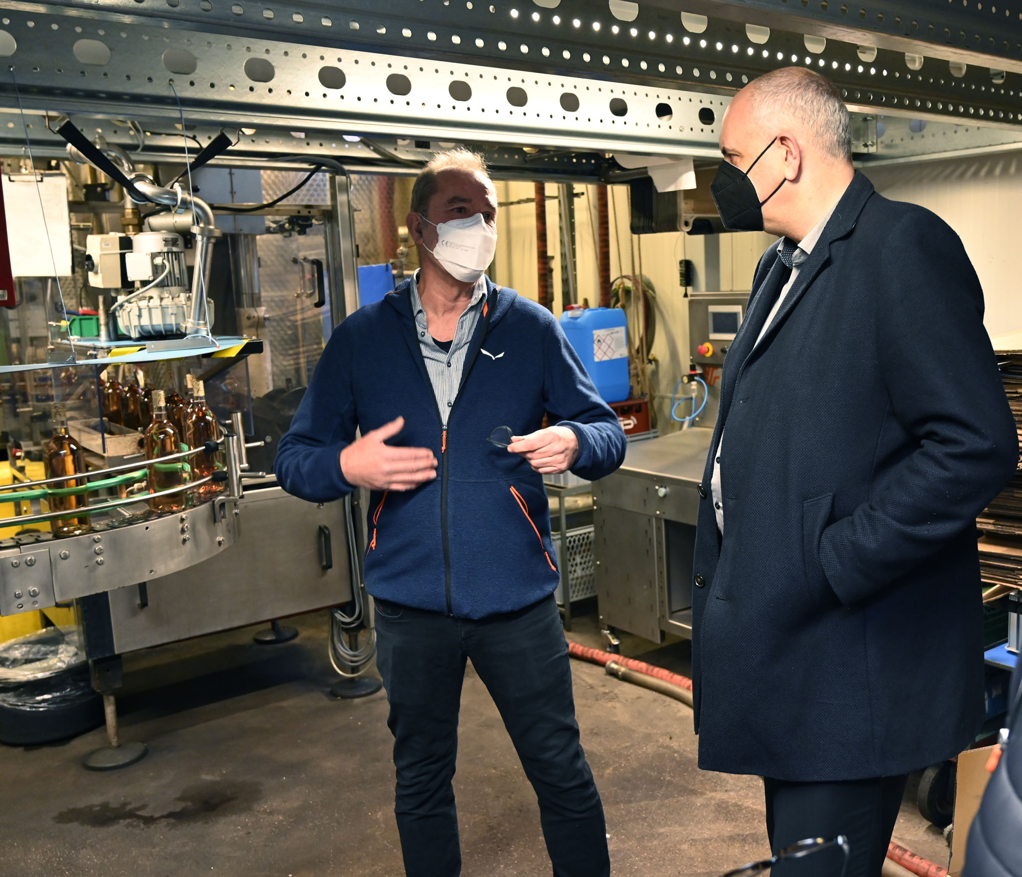VivoLoVin-Geschäftsführer Kai Schamar (links) erläutert Bürgermeister Dr. Andreas Bovenschulte die Abfüllanlage. Foto: Senatspressestelle