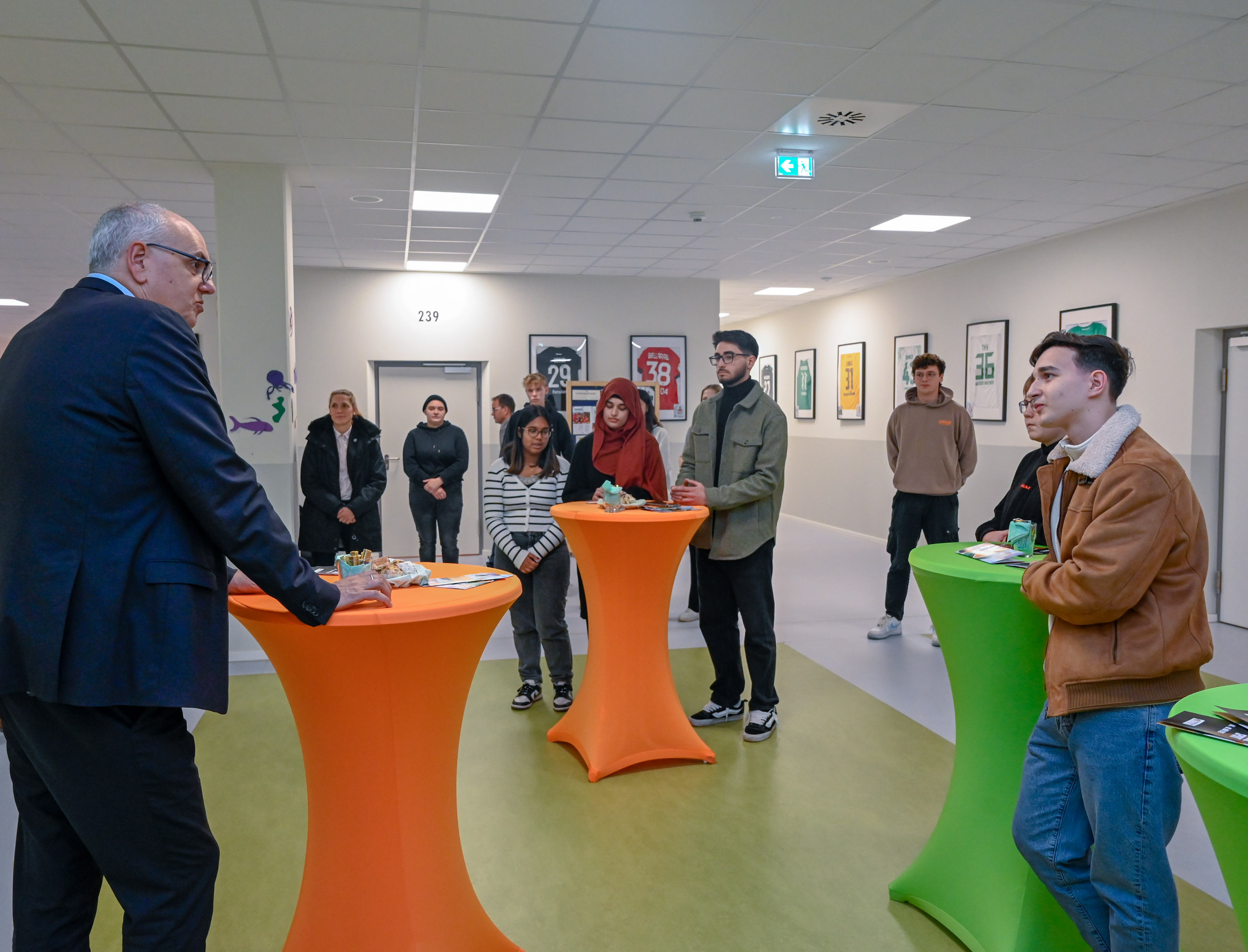 Drei Stationen standen am Donnerstag, 7. November 2024, auf dem Programm von Bürgermeister Andreas Bovenschulte, als er im Rahmen seiner Quartiersbesuche den Obervieland besucht hat. Ob bei Gesprächen mit den Schülerinnen und Schülern des Gymnasiums Links der Weser, im Austausch mit Mitarbeiterinnen und Teilnehmerinnen des "upsign"-Frauenprojekts von bras e.V. oder im Haus der Familie Obervieland: Der Bürgermeister erfuhr vor Ort, was die Menschen im Stadtteil bewegt.