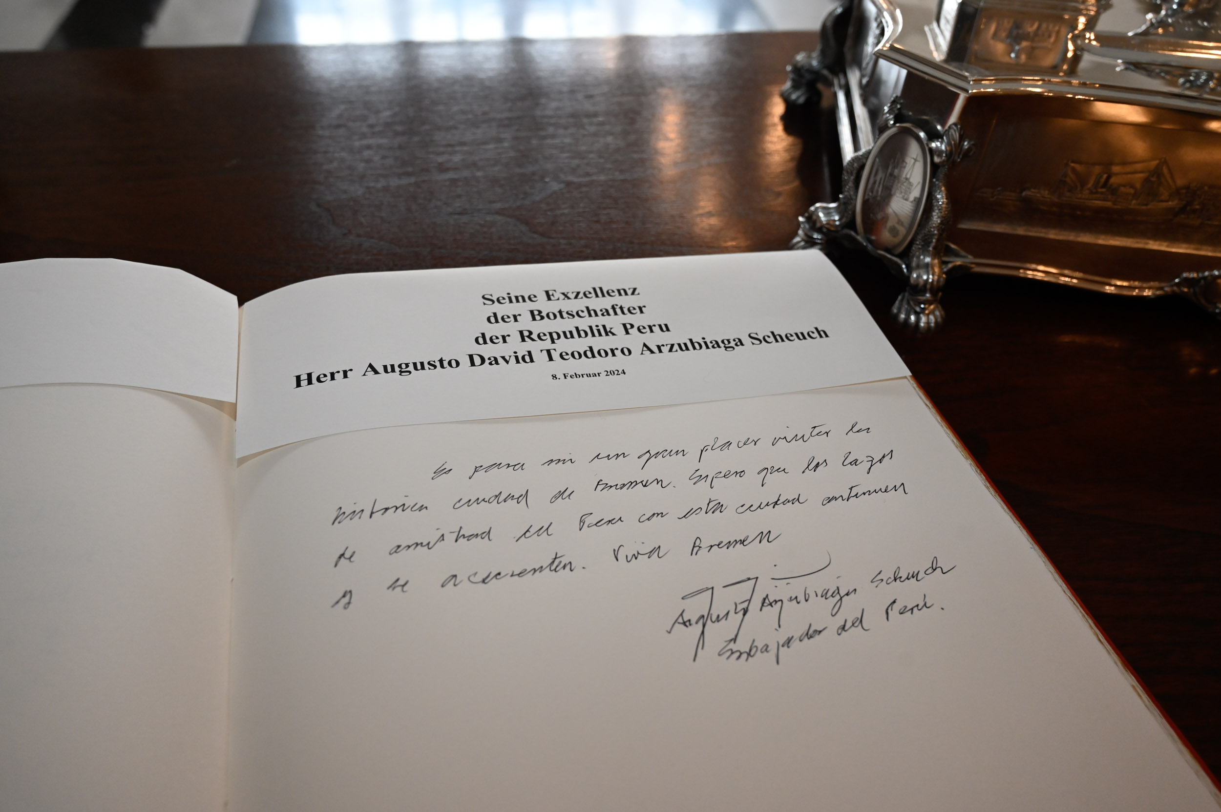 Zu Beginn des Besuchs trug sich der Botschafter in das Goldene Buch der Freien Hansestadt Bremen ein. Im Anschluss fand ein Gedankenaustausch in der Güldenkammer statt.