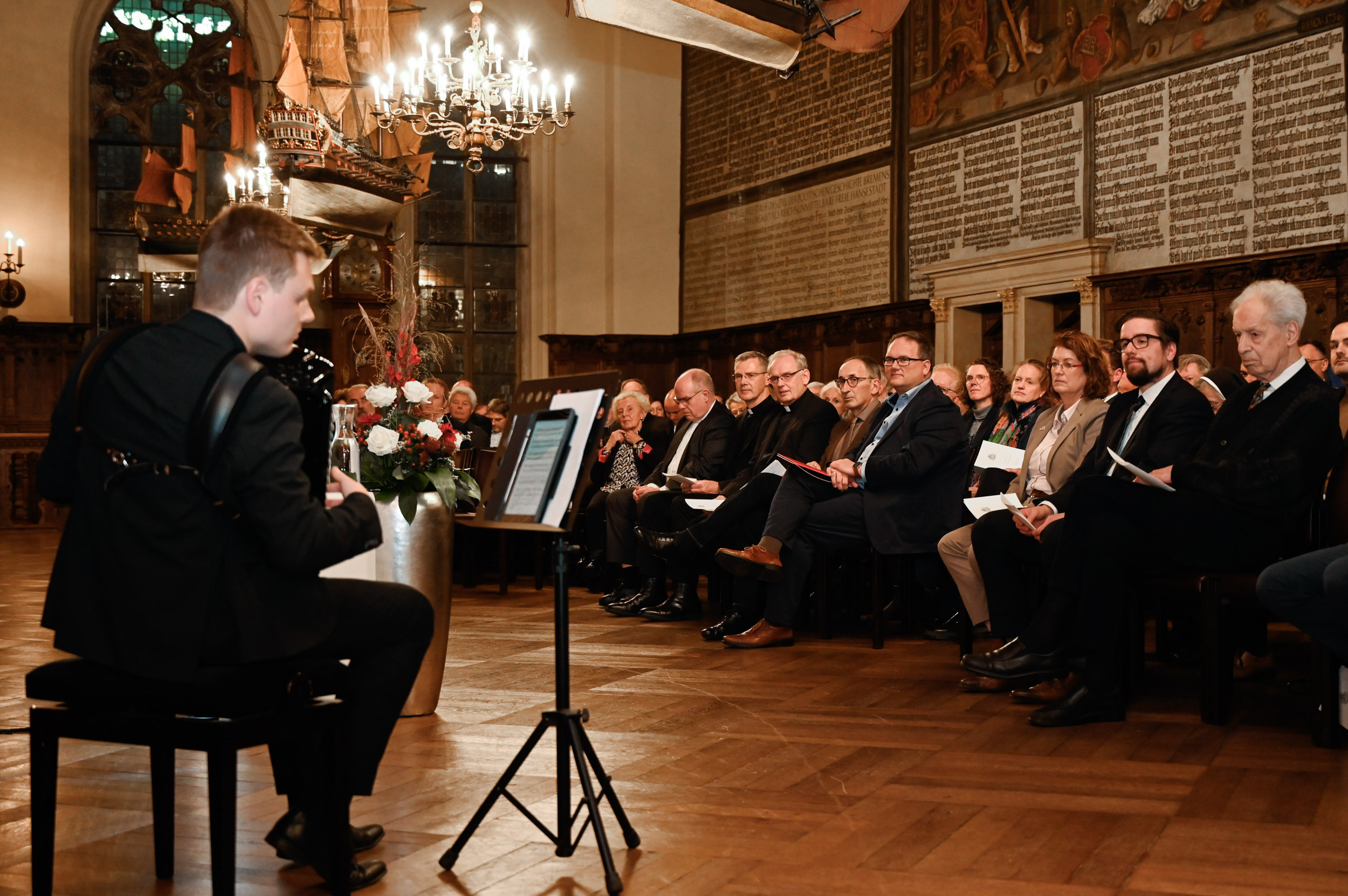 Bürgermeister Björn Fecker ging in seiner Rede auf die Wahl und ersten öffentlichen Erklärungen des neuen Papstes Leo XIV ein: "Mich hat es beeindruckt, dass Papst Leo XIV. den Kampf gegen die Armut ins Zentrum seines ersten Lehrschreibens gestellt hat, das vor gut vier Wochen Anfang Oktober veröffentlicht wurde: Er schreckt nicht davor zurück, scharfe Kritik an Kapitalismus und sozialer Ungleichheit zu üben. Er macht sich zum Systemkritiker eines Wirtschaftsmodells, in dem die Schere zwischen Arm und Reich immer weiter auseinander geht. Papst Leo hat klare Worte gefunden, mit denen er Egoismus und Gleichgültigkeit kritisiert und eine Kultur, die andere ausgrenzt, ohne es überhaupt zu bemerken."