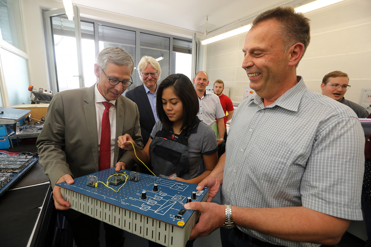 Bei seinem Besuch traf Bürgermeister Dr. Carsten Sieling unter anderem die angehende Kfz-Mechatronikerin in der System- und Hochvolttechnik Gladys Büssing sowie ihren Ausbilder Jens Unger (v.l.).