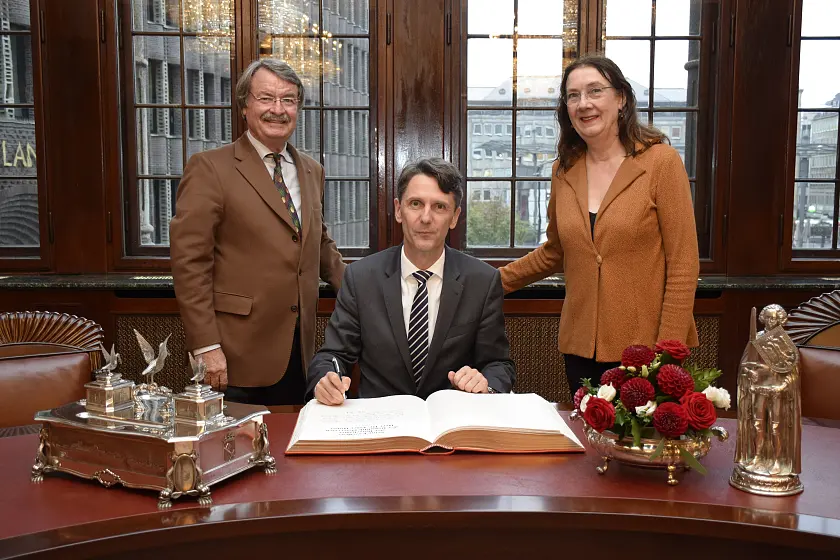 Nach dem Eintrag in das Goldene Buch Bremens als Gast der Freien Hansestadt nutzen Bürgermeisterin Linnert und Botschafter Huber die Gelegenheit, sich über die Schwerpunkte der zurzeit währenden EU-Ratspräsidentschaft auszutauschen. Vor diesem Hintergrund waren besonders die Frage zu den möglichen Auswirkungen für Handel und Industrie in Deutschland wie auch für die Bürgerinnen und Bürger der EU von Interesse, wenn es zu einem ‚harten Brexit‘ Großbritanniens kommen sollte, oder auch die Frage, wie die Europäische Union mit dem vorliegenden Haushaltsentwurf Italiens umgehen solle.
