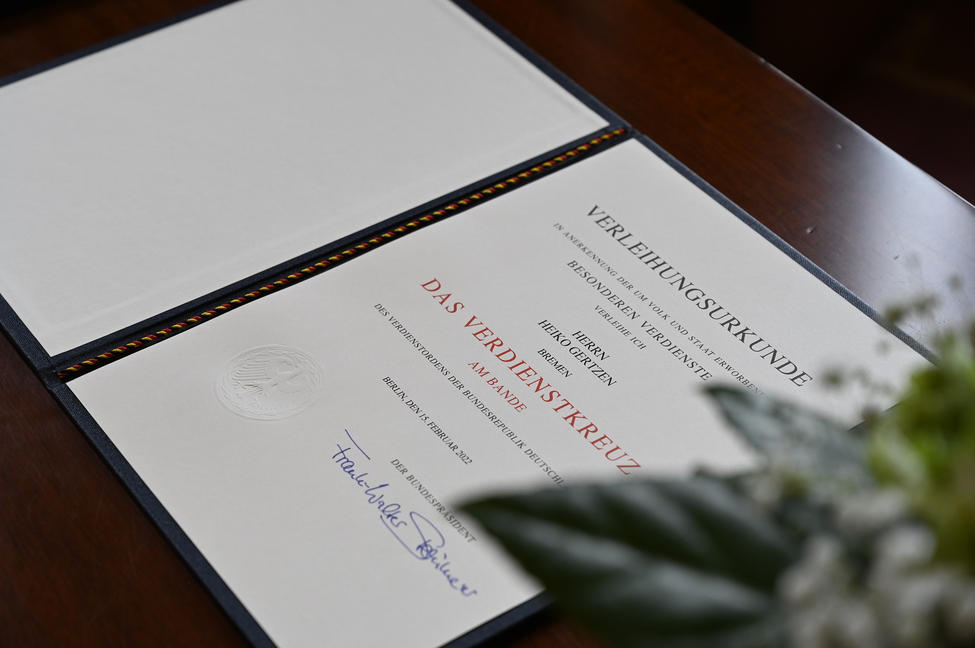 Für sein langjähriges ehrenamtliches Engagement hat der Bundespräsident dem ehemaligen Studiendirektor, Heiko Gertzen, das Verdienstkreuz am Bande verliehen. Der Präsident des Senats der Freien Hansestadt Bremen, Bürgermeister Dr. Andreas Bovenschulte hat dies heute (24. Juni 2022) im Rahmen einer Kaffeetafel im Senatssaal überreicht.