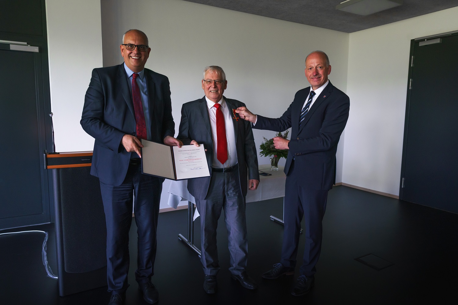 Bürgermeister Dr. Andreas Bovenschulte (links) und Stadtverordnetenvorsteher Torsten von Haaren (rechts), überreichen Hans-Walter Keweloh das Bundesverdienstkreuz. Foto: Pheline Hanke / Pressestelle Magistrat