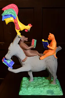 Entschieden haben sich die Kinder dann für eine ganz klassische Variante: Der Esel trägt ein graues Fell, der Hund hat einen braunen Pelz, die Katze leuchtet in orange und der Hahn hat schillernd bunte Federn. Das Buch, das der Esel liest, hat natürlich einen Bezug zu Bremen, es trägt den schlichten Titel HB.