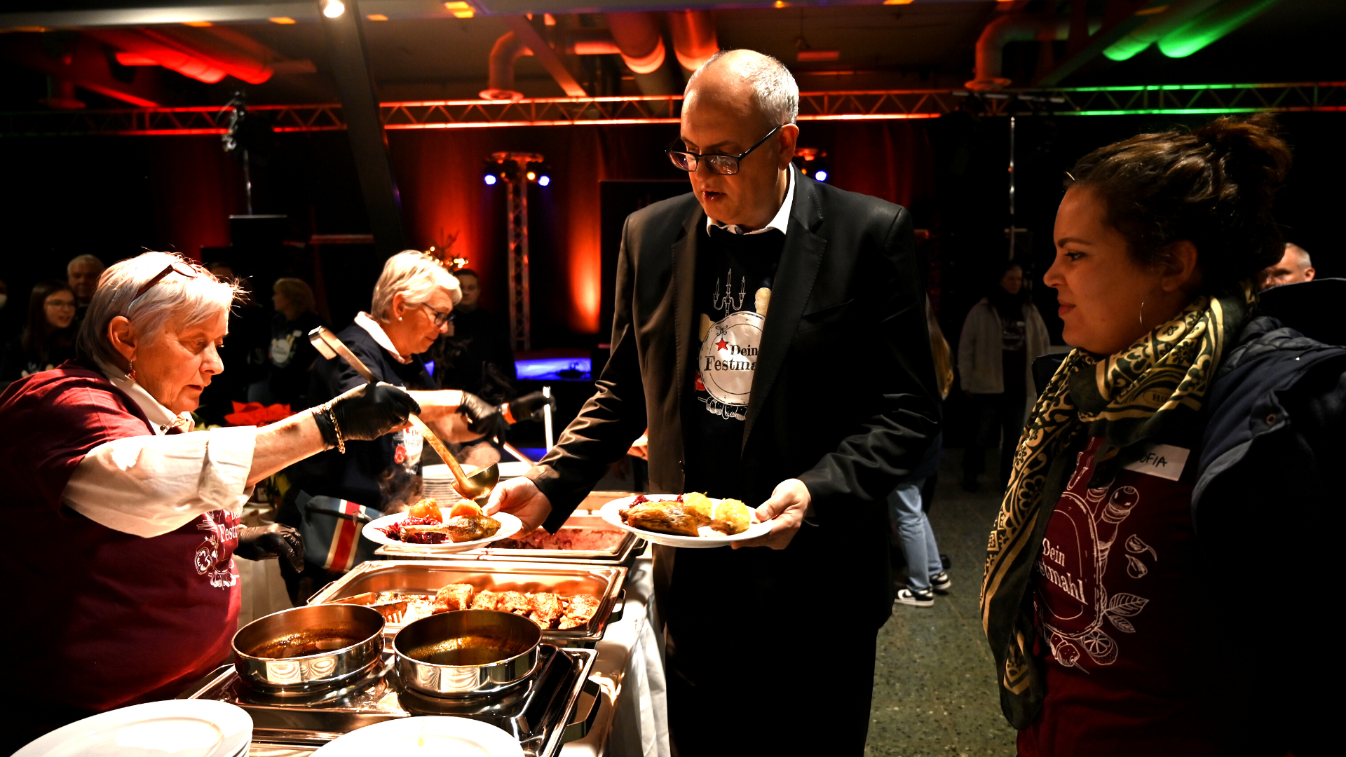 Während es in den vergangenen zwei Jahren pandemiebedingt lediglich ein "Festmahl to go" unter freiem Himmel geben konnte, fand die Benefizaktion nun erstmals wieder als Präsenzveranstaltung in der Messehalle 4 statt. Rund zwei Stunden gab es für die rund 1.000 Gäste ein buntes Rahmenprogramm. Die prominenten Helferinnen und Helfer servierten dabei nicht nur Entenkeule, Rotkohl, Kartoffelknödel und andere Köstlichkeiten, sondern sorgten auf einer Bühne auch für Unterhaltung.