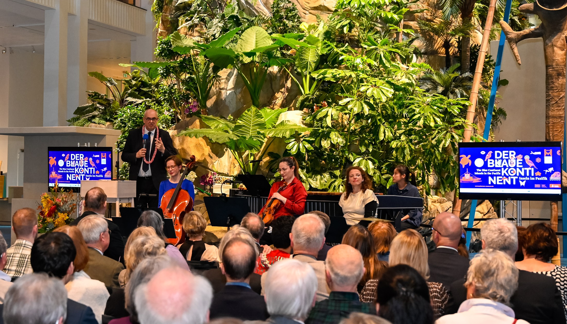 28.03.2025Die neue Dauerausstellung des Übersee-Museums mit dem Titel "Der blaue Kontinent - Inseln im Pazifik", die in enger Zusammenarbeit mit Vertreterinnen und Vertretern aus dem pazifischen Raum entstanden ist, widmet sich den Themen kulturelle und biologische Diversität, Identität, Ressourcennutzung, Klimawandel und der kolonialen Vergangenheit Ozeaniens. Am Donnerstagabend (27. März 2025) begrüßte Bürgermeister und Kultursenator Andreas Bovenschulte zusammen mit der Direktorin des Übersee-Museums, Prof. Dr. Wiebke Ahrndt, den Präsidenten des Musée de Quai Branly Jacques Chirac in Paris, Emmanuel Kasarhérou, und den Staatsministerinnen Sarah Ryglewski und Katja Keul die fast 500 Gäste anlässlich der Eröffnungsveranstaltung. Musikalisch begleitet wurden die Redebeiträge von den Bremer Philharmonikern.