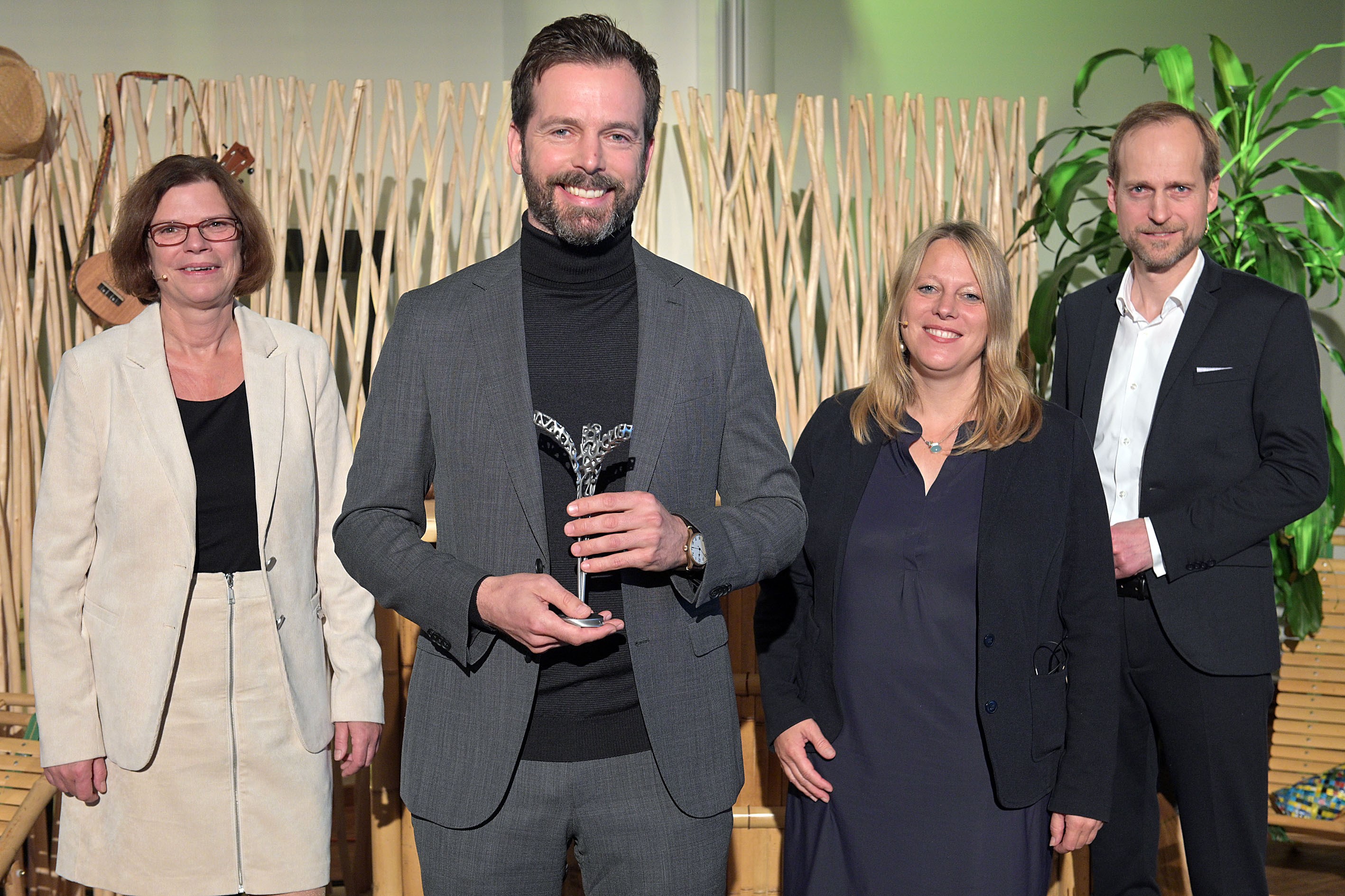 Sie gratulierten dem Gewinner des Bremer Umweltpreis 2021 als erste: Wirtschaftssenatorin Kristina Vogt (links),  Klimaschutz- und Umweltsenatorin Dr. Maike Schaefer und Ralf Stapp (rechts), Geschäftsführer BAB – Die Förderbank, zusammen mit Hans Jaich, Geschäftsführer im-jaich oHG Wasserwelten. Foto: BAB