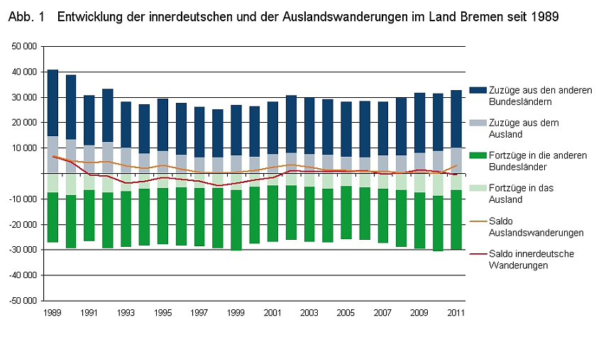 Der Wanderungsaustausch des Landes Bremen mit den anderen Bundesländern war dagegen negativ. Zwar ist die Zahl der Zuzüge im Vergleich zu 2010 um 79 auf 22 699 angestiegen, jedoch sind auch 23 263 Personen aus Bremen fortgezogen, 1 495 mehr als im Jahr davor. Daraus ergibt sich ein Einwohnerverlust von 564 Personen (2010: +852). Insbesondere gegenüber den anderen Stadtstaaten hat das Land Bremen Einwohner verloren. Hier ergab die Bilanz aus Zu- und Fortzügen einen Verlust von 487 Einwohnern an Hamburg und 311 an Berlin. Auch nach Bayern und Baden-Württemberg wanderten 253 bzw. 216 mehr Personen ab als von dort zuzogen. Einwohner gewinnen konnte Bremen dagegen aus den Wanderungsbewegungen von und nach den norddeutschen Flächenländern. So waren die Zuzüge aus Niedersachsen um 195, aus Schleswig-Holstein um 119 und aus Mecklenburg-Vorpommern um 107 höher als die jeweiligen Fortzüge dorthin.