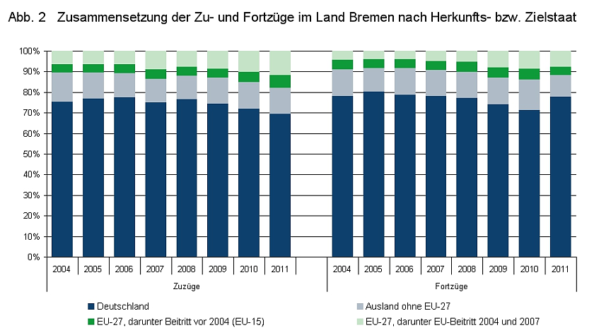 Mit 5 869 Personen hatten die EU-Staaten (EU-27) den größten Anteil an den Zuzügen aus dem Ausland, vor allem aus Polen mit 1 420, Bulgarien mit 1 404, Rumänien mit 481, Spanien mit 467, Italien mit 322, Frankreich mit 244, Großbritannien mit 221 und Griechenland mit 187 Personen. Aus dem übrigen Europa waren 1 288 Personen zugewandert, davon 568 aus der Türkei. Weitere 1 590 neue Bürger kamen aus asiatischen, 694 aus amerikanischen und 409 aus afrikanischen Ländern nach Bremen. In Aufrechnung mit der Anzahl der jeweils in diese Regionen Abgewanderten ergab sich „unter dem Strich“ für das Land Bremen ein Zugewinn von 2 372 Einwohnerinnen und Einwohnern aus EU-Staaten, darunter 617 aus Polen, 567 aus Bulgarien, 268 aus Spanien, 199 aus Italien und 158 aus Rumänien sowie 590 aus Asien und 172 aus Afrika.