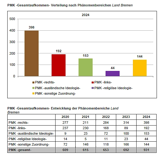 Die politisch motivierte Kriminalität (PMK) im Land Bremen ist im vergangenen Jahr in nahezu allen Phänomenbereichen deutlich angestiegen: Insgesamt wurden 931 Fälle registriert – ein Zuwachs um rund 35 Prozent gegenüber dem Vorjahr (2023: 663). Insbesondere antisemitische Straftaten (2024: 107 / 2023: 71) und Angriffe gegen Politikerinnen und Politikerinnen (2024: 93 / 2023: 50) haben stark zugenommen, ebenso wie Delikte im Zusammenhang mit den internationalen Krisenlagen und gesellschaftlichen Protestbewegungen.