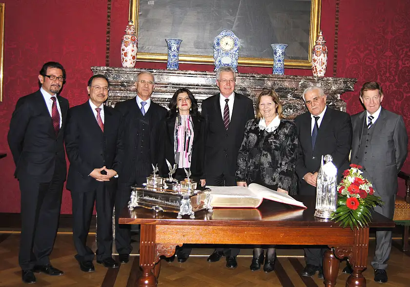 Zur Gründungsfeier der DAFG - Regionalbereich Bremen reisten Vertreterinnen und Vertreter aus Ägypten, Jordanien, Kuwait, Libanon, Libyen, Marokko, Palästina, Saudi-Arabien, Syrien und Tunesien, sowie ein Vertreter der palästinensischen Autonomiegebiete an. Begrüßt wurden sie im Kaminsaal des Rathauses von Bürgermeister Jens Böhrnsen. Dabei trugen sie sich auch in das Goldene Buch Bremens ein. In diesem Fall handelt es sich um Einträge mit einem gewissen Seltenheitswert, denn es kommt nicht oft vor, dass so viele Einträge in Folge von rechts nach links ins goldene Buch geschrieben werden.