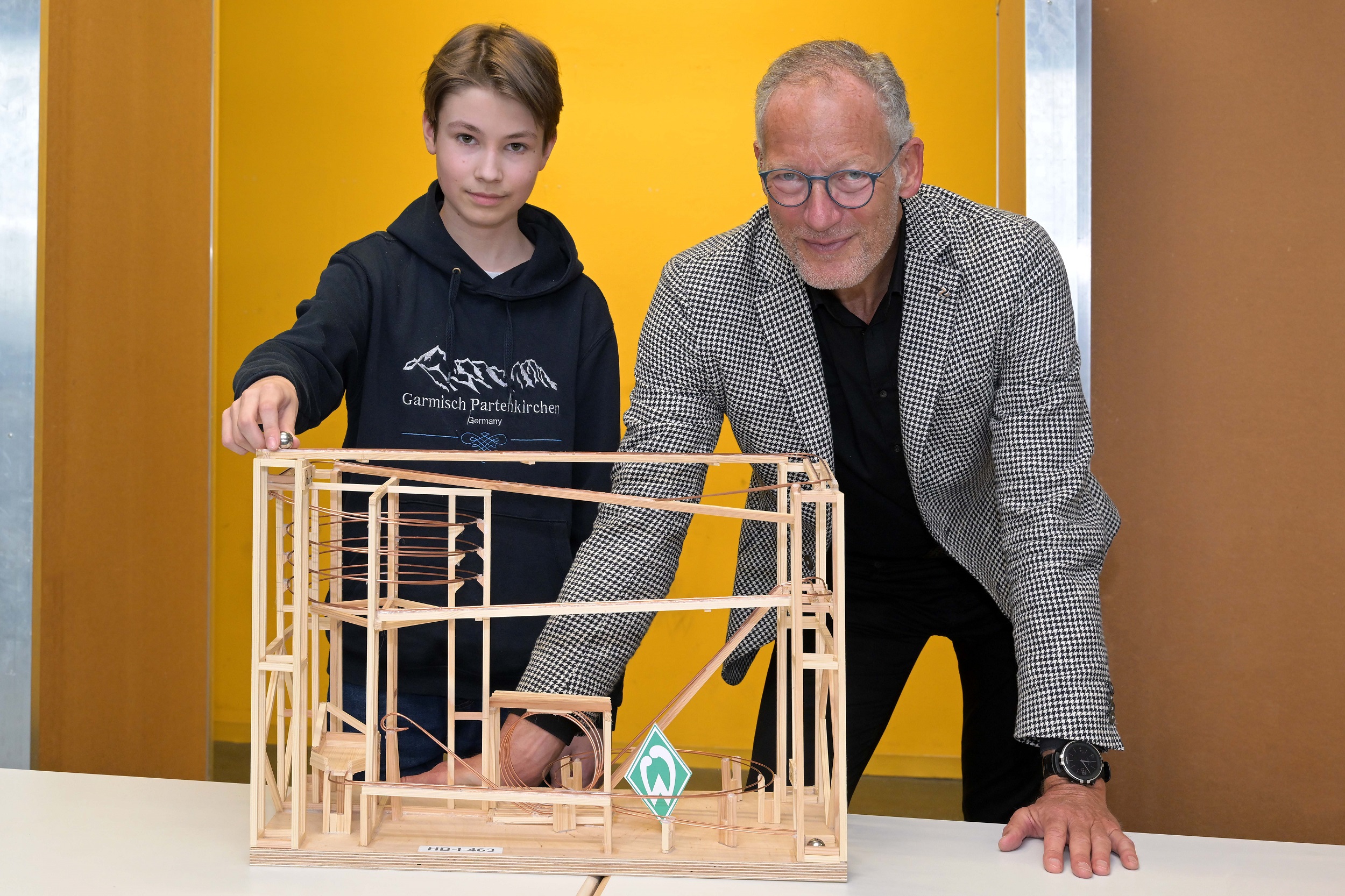 Torsten Sasse, Präsident der Ingenieurkammer Bremen, freute sich in Berlin mit dem Preisträger, der sich mit der Rautenform seines Modells als Werder-Fan präsentierte: "Die Achterbahn 'Rund um die Raute' hält, was sie verspricht: Hier läuft die Kugel rund, getreu dem Fußball-Motto 'das Runde muss in das Eckige' und das zuverlässig wie ein Uhrwerk."