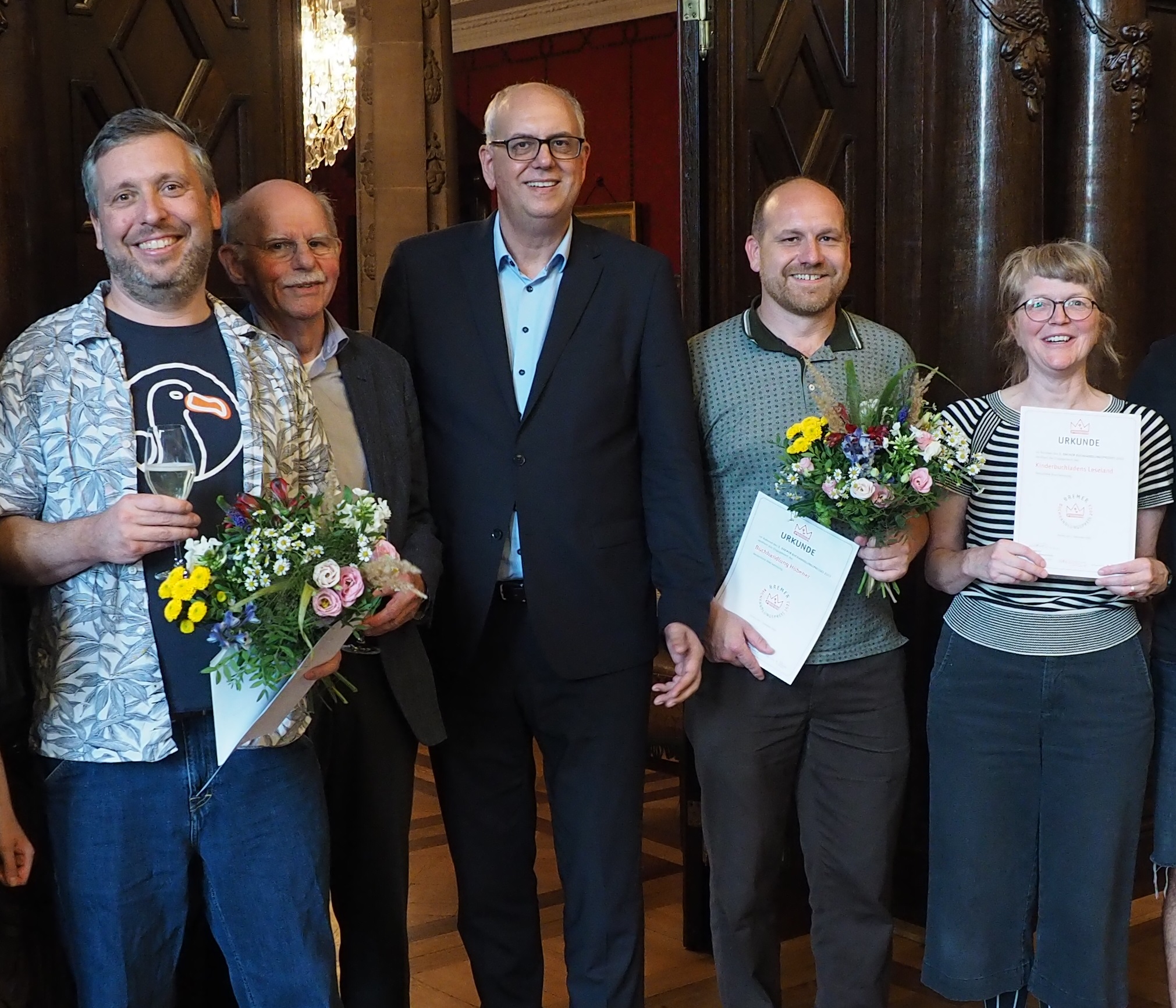 Die Gewinner und Gewinnerin des Bremer Buchhandlungspreises 2023 mit Bürgermeister Andreas Bovenschulte (Bildmitte): Michael Hockel und Hermann Figge (1.u.2.v.l., Albatros Buchhandlung, 1. Preis), Jens Fleischer  (2.v.r., Buchhandlung Hübener, Anerkennungspreis) und Petra Maurer (1.v.r., Kinderbuchladen Leseland, Anerkennungspreis). Foto: Rike Oehlerking