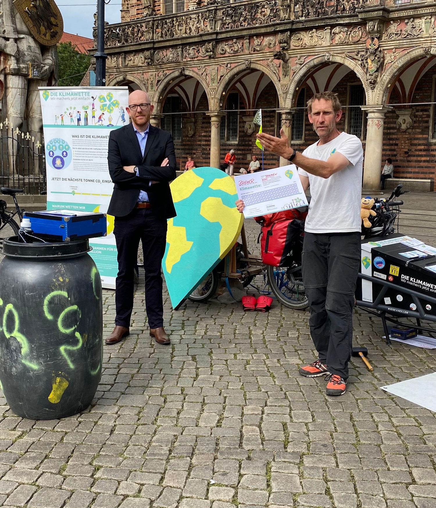 Die Klimawette zeigt spielerisch auf, wie jeder und jede einfach einen großen Beitrag für den Klimaschutz leisten kann. Bremen nimmt die Herausforderung an und beteiligt sich an der bundesweiten Aktion mit einer eigenen Klimawette. Ronny Meyer, Staatsrat für Umwelt und Verkehr bei der Senatorin für Klimaschutz, Umwelt, Mobilität, Stadtentwicklung und Wohnungsbau hat vergangene Woche auf dem Marktplatz die Klimawette für Bremen angenommen. Bis zur Weltklimakonferenz in Glasgow sollen durch die Bremer Bürgerinnen und Bürger 8.513 Tonnen CO2 eingespart werden.