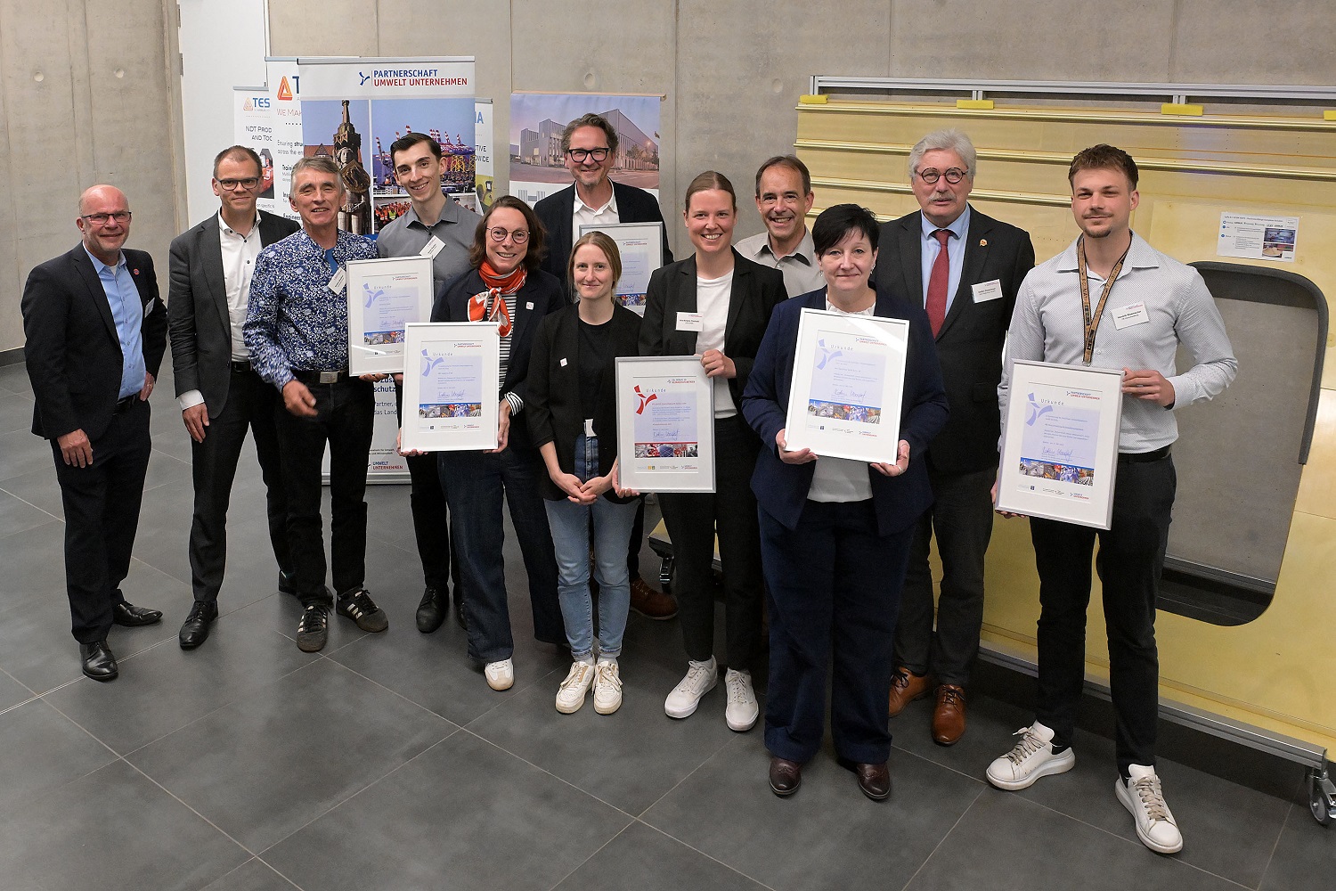 28.05.2025Jedes Jahr trifft sich die "Partnerschaft Umwelt Unternehmen" und bringt unterschiedliche Unternehmen zusammen, die der Umwelt- und Naturschutz verbindet. Rund 100 Gäste erfuhren beim gestrigen (27. Mai 2025) Jahresempfang im Forschungs- und Technologiezentrum Ecomat mehr über klimaneutrales Fliegen, Möglichkeiten des 3D-Drucks und den Bremer Biodiversitätsindex. Gleichzeitig lernten sie die fünf neuen Mitglieder der Umweltpartnerschaft und einen frisch ausgezeichneten Klimaschutzbetrieb kennen. Mit insgesamt 250 engagierten Unternehmen ist das Netzwerk so groß wie nie zuvor.