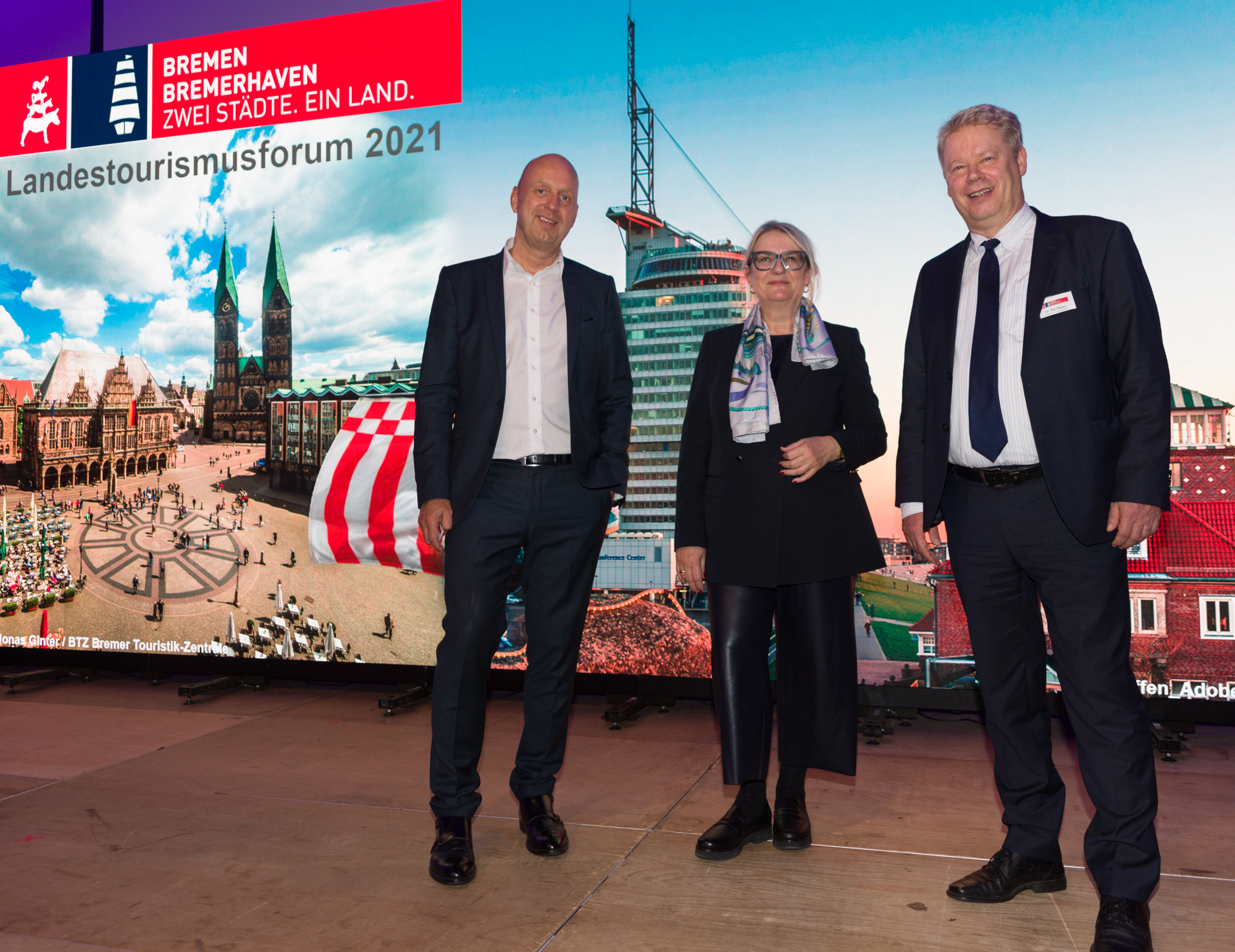 03.11.2021Große Namen beim zweiten Landestourismusforum des Bundeslandes Bremen am 2. November 2021 im Fischbahnhof in Bremerhaven: Rund 110 Tourismusexpertinnen und –experten erlebten eine motivierende Petra Hedorfer, Vorsitzende des Vorstandes Deutsche Zentrale für Tourismus (DZT), die getreu dem Motto des Abends "Buten un Binnen. Wagen un Winnen" wichtige aktuelle Erkenntnisse des internationalen Marktgeschehens mitbrachte. Neben der Senatorin für Wirtschaft, Arbeit und Europa (SWAE), Kristina Vogt, und Bremerhavens Oberbürgermeister, Melf Grantz, sprachen auch Team-Manager Alfred Prey von Bremerhavens Eishockey Bundesliga-Mannschaft Fischtown Pinguins sowie Rekord-Tanztrainer Roberto Albanese des Grün-Gold-Clubs aus Bremen. Weitere achtzig Touristikerinnen und Touristiker verfolgten die Ausführungen digital und sahen auch die optimistisch gestimmten Tourismusgeschäftsführer, Dr. Ralf Meyer (Bremerhaven) und Oliver Rau (Bremen).
