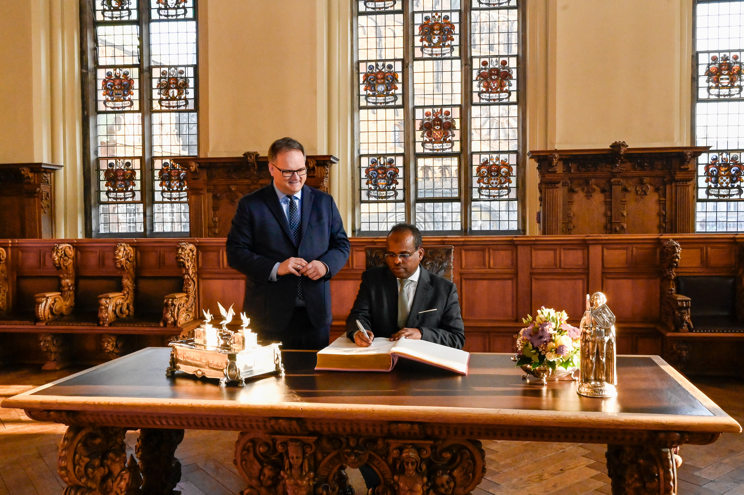 Am heutigen Donnerstag (22. Januar 2026) begrüßte Bürgermeister Björn Fecker Botschafter Yacin Houssein Doualé der Republik Dschibuti im Bremer Rathaus. Nach der Begrüßung trug sich Botschafter Doualé ins Goldene Buch der Freien Hansestadt Bremen ein. In dem darauffolgenden gemeinsamen Gespräch wurde über Themen wie Hafen, Handel, Wissenschaft und Energie gesprochen. Zuvor führten den dschibutischen Botschafter weitere Termine in die Bremische Bürgerschaft und Handelskammer Bremen - IHK für Bremen und Bremerhaven.