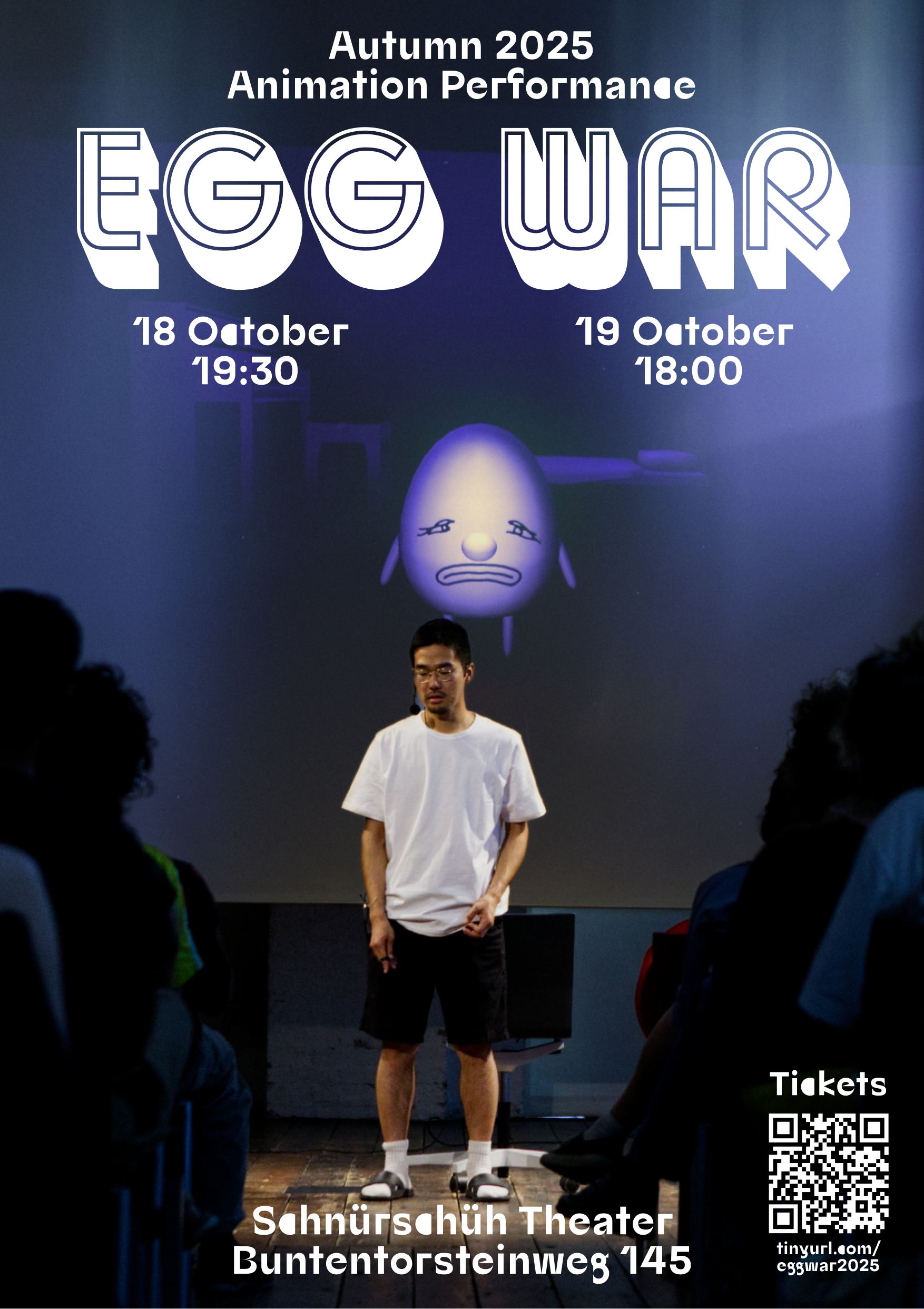 "Egg War - Animation Performance" ist eine queer-feministische Show mit musikalischen und komödiantischen Elementen, die die absurden Herausforderungen und anhaltenden Kämpfe thematisiert, mit denen Migranten und Queers im heutigen Leben konfrontiert sind. Das Stück verwendet Eier als Symbole für Zerbrechlichkeit und neues Leben und behandelt Themen wie Machtabbau, Aktivismus und sexuelles Verlangen.