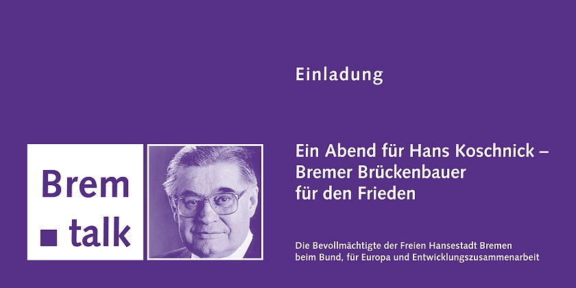 Die Bevollmächtigte der Freien Hansestadt Bremen beim Bund, für Europa und Entwicklungszusammenarbeit, Staatsrätin Ulrike Hiller, lädt am morgigen Dienstag, 29. November 2016, 19 Uhr, im Rahmen der Veranstaltungsreihe "brem.talk – hans jessen und gäste" zu einem "Abend für Hans Koschnick – Bremer Brückenbauer für den Frieden" in die Bremer Landesvertretung (Hiroshimastraße 24, 10785 Berlin) ein. "Wir wollen an das Leben und Schaffen des ehemaligen Bremer Bürgermeisters erinnern, der am 21. April dieses Jahres im Alter von 87 Jahren verstarb. Hans Koschnick hat mit seiner Persönlichkeit, seiner Volksverbundenheit und seinem unerschütterlichen Glauben an die Versöhnung und Verständigung zwischen den Völkern unauslöschliche Spuren hinterlassen", sagt Gastgeberin Ulrike Hiller im Vorfeld der Veranstaltung, an der auch andere prominente Bremer Persönlichkeiten teilnehmen.