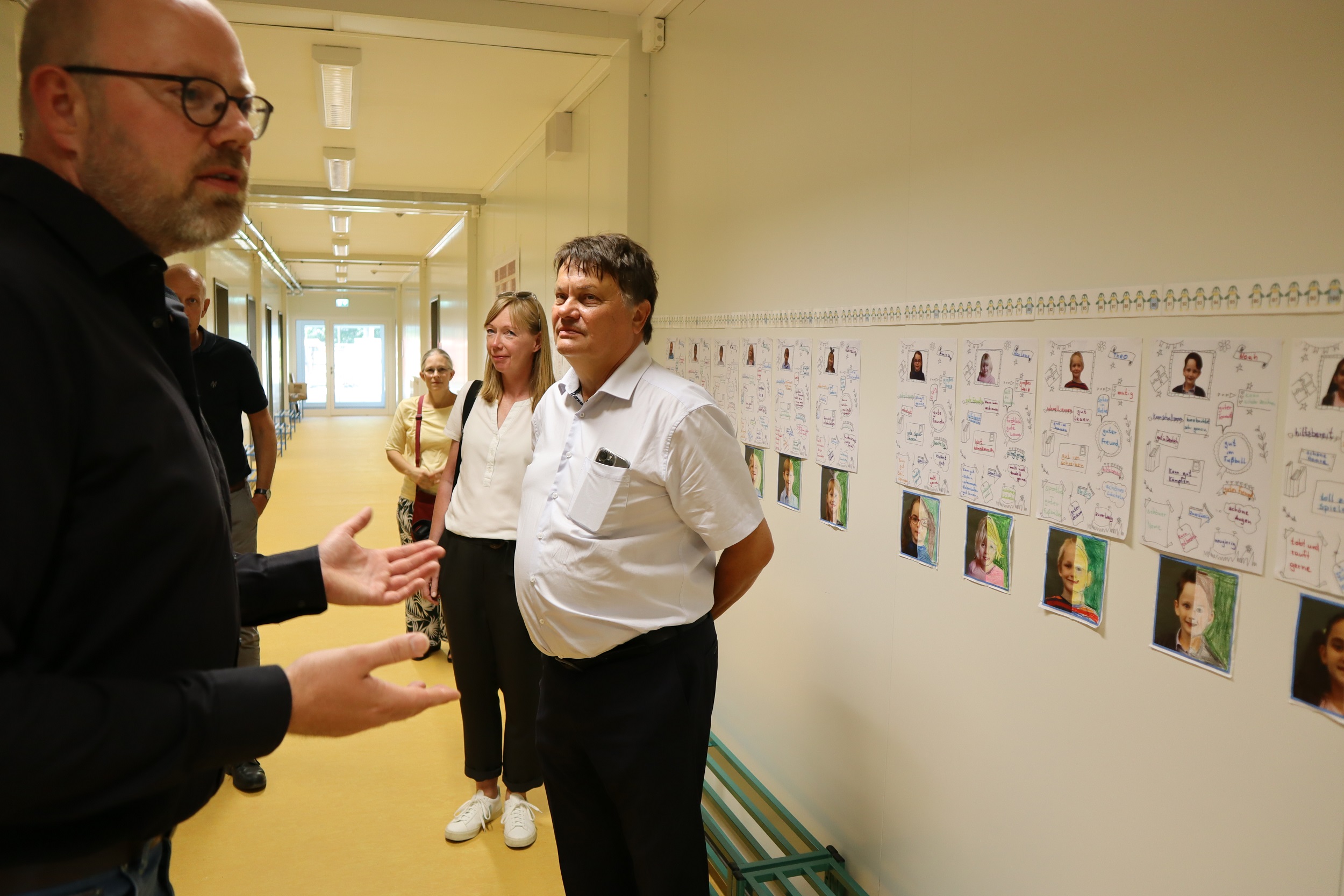 Vor einem der Klassenräume in der Schule (v.l.) Schulleiter Sebastian Gerber, Projektleiterinnen bei Immobilien Bremen Sabine Leskow-Mategka Christiane Berding, Finanzsenator Dietmar Strehl – sie unterhalten sich vor einem Klassenraum. Foto: Finanzressort