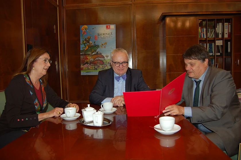 Dietmar Strehl (rechts) überreicht in Anwesenheit seiner Amtsvorgängerin Karoline Linnert Staatsrat Lühr (Mitte) die Urkunde zum 50jährigen Dienstjubiläum