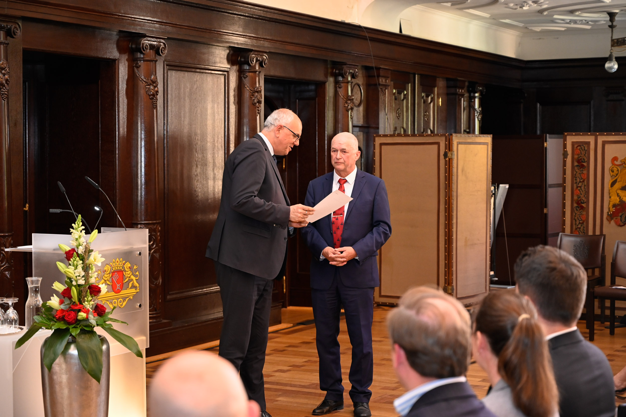 28.04.2025Mit einer Feierstunde im Bremer Rathaus hat sich am heutigen Montag (28. April 2025) der langjährige Landeskonservator und Leiter des Landesamtes für Denkmalpflege Bremen, Prof. Dr. Georg Skalecki, vor zahlreichen Gästen aus Kultur, Wissenschaft, der Wirtschaft Bremens sowie auswärtigen Fachkolleginnen und -kollegen verabschiedet. Bürgermeister und Kultursenator Dr. Andreas Bovenschulte würdigte in seiner Rede den Kunsthistoriker und Denkmalpfleger, der in Bremen seit 2001 im Amt tätig war. Weitere Redner zum Anlass der Verabschiedung waren Prof. Dr. Markus Harzenetter, der Vorsitzende der Vereinigung der Denkmalfachämter in den Ländern, Oliver Platz, Präsident der Architektenkammer Bremen, und Uwe Schwartz vom Landesamt für Denkmalpflege Bremen.
