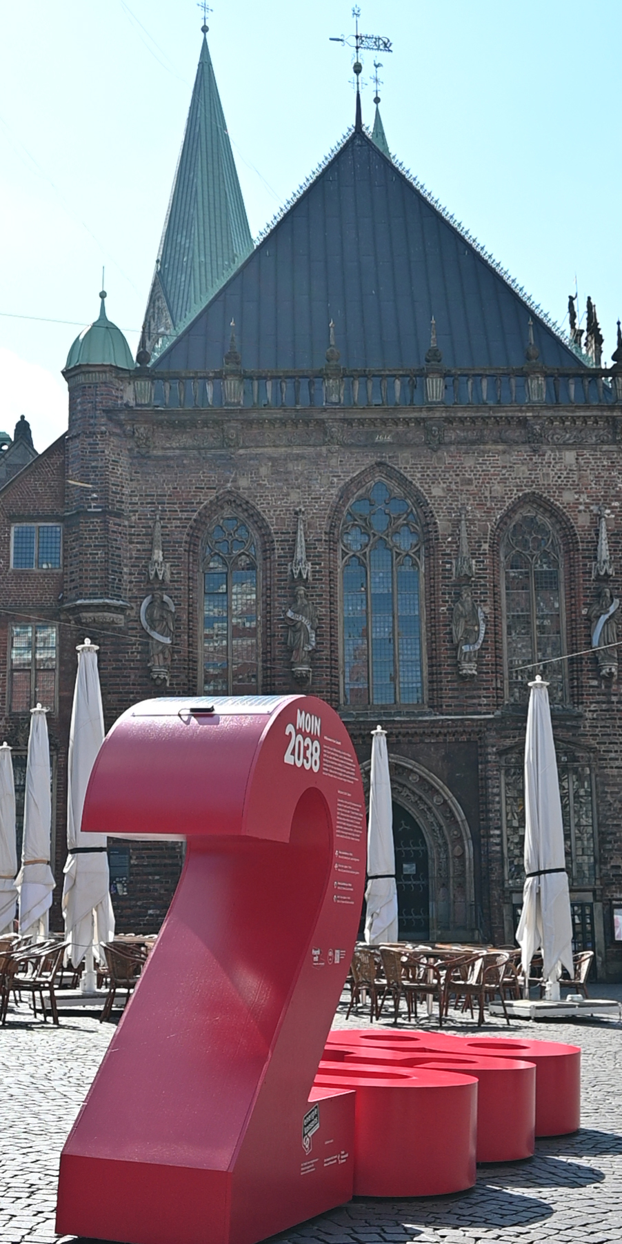 24.06.2024Klimaneutral bis 2038 – das ist das Ziel, das sich das Land Bremen mit seinen zwei Städten an der Weser gesetzt hat. Doch wie kann man sich ein Leben in einer klimaneutralen Stadt Bremen vorstellen? Ideen dazu zeigt – beziehungsweise erzählt – die neue interaktive Installation "Moin 2038", die die gemeinnützige Klimaschutzagentur energiekonsens im Rahmen ihrer Kampagne "#senkmit: Weniger CO2, mehr Zukunft" in der Bremer Innenstadt aufgebaut hat. Dafür steht die Zahl "2038" menschengroß bis zum 30. September auf dem Liebfrauen-Kirchhof. Besucherinnen und Besucher können auf ihr Platz nehmen und zwei Audio-Geschichten aus der Zukunft lauschen. Gefördert wird die Aktion von der Senatorin für Umwelt, Klima und Wissenschaft.