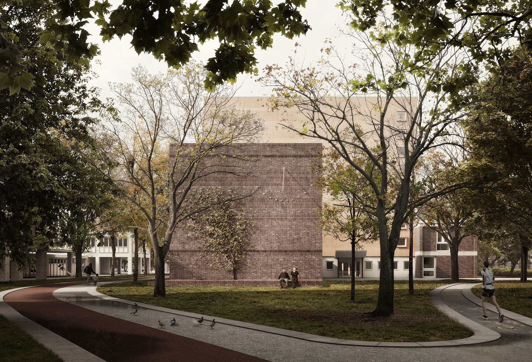 Die Konturen des viergeschossigen neuen Gebäudes fügen sich präzise in das verfügbare Baufenster und in den städtebaulichen Kontext der hochkarätigen Denkmale der Nachkriegsmoderne ein. Ein zurückhaltend dimensionierter eingeschossiger Annex berührt sehr maßvoll den denkmalgeschützten Archivturm und integriert beide Gebäudeteile mit funktional begründeten Räumen für den Archivbetrieb. Es entsteht ein besonderes Zusammenspiel des neuen Bausteins mit dem Archivturm und seinem Flugdach über dem Eingang sowie dem zweigeschossigen Verwaltungsgebäude entlang der Straße am Archiv. Das erweiterte Ensemble wird so auf sehr selbstverständliche Weise im grünen Stadtraum erlebbar.