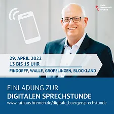 07.04.2022Bürgermeister Andreas Bovenschulte lädt Bürgerinnen und Bürger aus den Stadtteilen Findorff, Walle, Gröpelingen und Blockland zu einer digitalen Sprechstunde ein am Freitag, 29. April 2022, in der Zeit von 13 bis 15 Uhr.