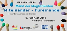 Markt der Möglichkeiten, unter der Schirmherrschaft der Sozialsenatorin Anja Stahmann, am 6. Februar 2016, 14-18 Uhr, Volkshochschule Bremen, Faulenstraße 69 (Bamberger Haus), Einlass ist ab 13.45 Uhr.