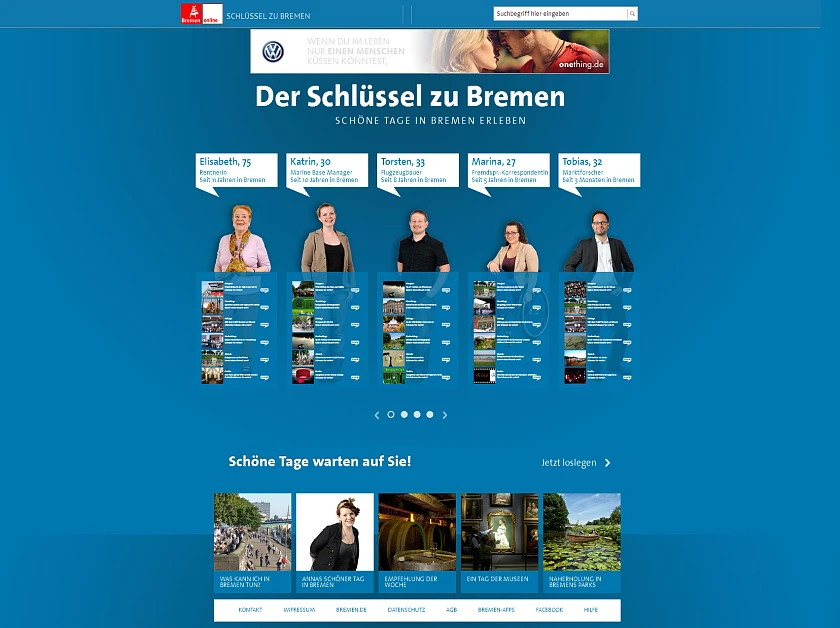 Eine wichtige Rolle in dieser Willkommenskultur übernimmt das Stadtportal bremen.de. Mit rund zehn Millionen Seitenaufrufen im Monat ist bremen.de für viele, die sich für die Freie Hansestadt interessieren, die erste Adresse bei der Recherche im Internet. Deshalb geht bremen.de jetzt mit zwei neuen Angeboten online: mit dem Neubürger-Portal „Neu in Bremen?“ und der Web-Applikation „Der Schlüssel zu Bremen“. Realisiert wurden diese Projekte während der vergangenen sechs Monate in enger Zusammenarbeit mit der WFB Wirtschaftsförderung Bremen und der Bremer Digitalagentur artundweise, die mit dem „Schlüssel zu Bremen“ ein bislang einmaliges Konzept zur individuellen Gestaltung eines „schönen Tages“ entwickelt hat.