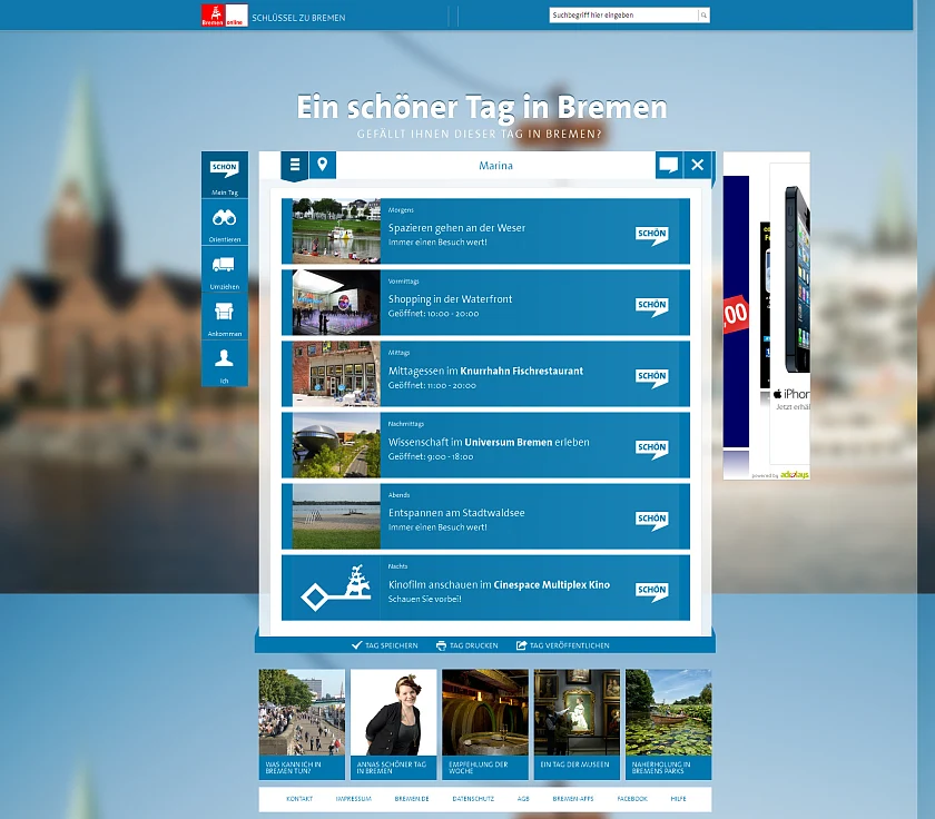 Mit dem „Schlüssel zu Bremen“ sieht Sklorz eine gute Chance, an die Pioniererfolge von bremen.de anzuschließen: „Der ,Schlüssel’ ist einmalig – eine solche Anwendung gibt es noch nicht.“ Wer – im Neubürger-Portal oder direkt unter der Webadresse www.schluessel.bremen.de – die Browseranwendung aufruft, trifft dort auf einen Begleiter, der beinahe unerschöpflich Anregungen und Vorschläge zum Kennenlernen der Freien Hansestadt gibt und gleichzeitig praktische Hilfe beim Umziehen, Orientieren und Ankommen in der Stadt leistet. Herz der Anwendung, die von der Bremer Digitalagentur artundweise konzipiert wurde, ist „Ein schöner Tag in Bremen“; in sechs Zeitfenstern – morgens, vormittags, mittags, nachmittags, abends und nachts – werden dem Nutzer ganz unterschiedliche Tipps angezeigt, um Bremen kennenzulernen. „Der ,Schlüssel’ verwandelt meine Interessen, meine Vorlieben, meine Hobbys in konkrete Vorschläge, aus denen ich mir meinen ,schönen Tag’ zusammenstellen und so die Stadt ganz individuell erleben kann“, erklärte Carsten Teller, Leiter Kreation bei artundweise, „mit meinen Klicks auf ,Schön’ lernt mich die Anwendung immer besser kennen; ich kann die Vorschläge speichern und mit Freunden teilen.“