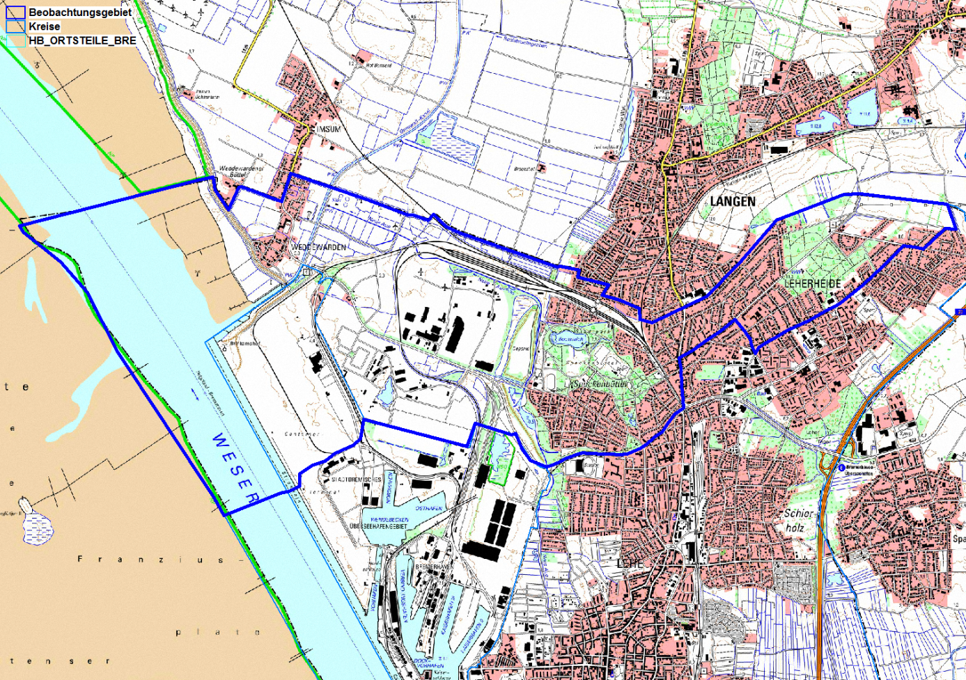 Das Beobachtungsgebiet umfasst den nördlichen Teil der stadtbremischen Häfen in Bremerhaven, die Ortsteile Weddewarden, Speckenbüttel sowie die nördlichen Teile von Leher Heide. Die genaue Lage des Beobachtungsgebietes ist aus der angefügten Karte ersichtlich.