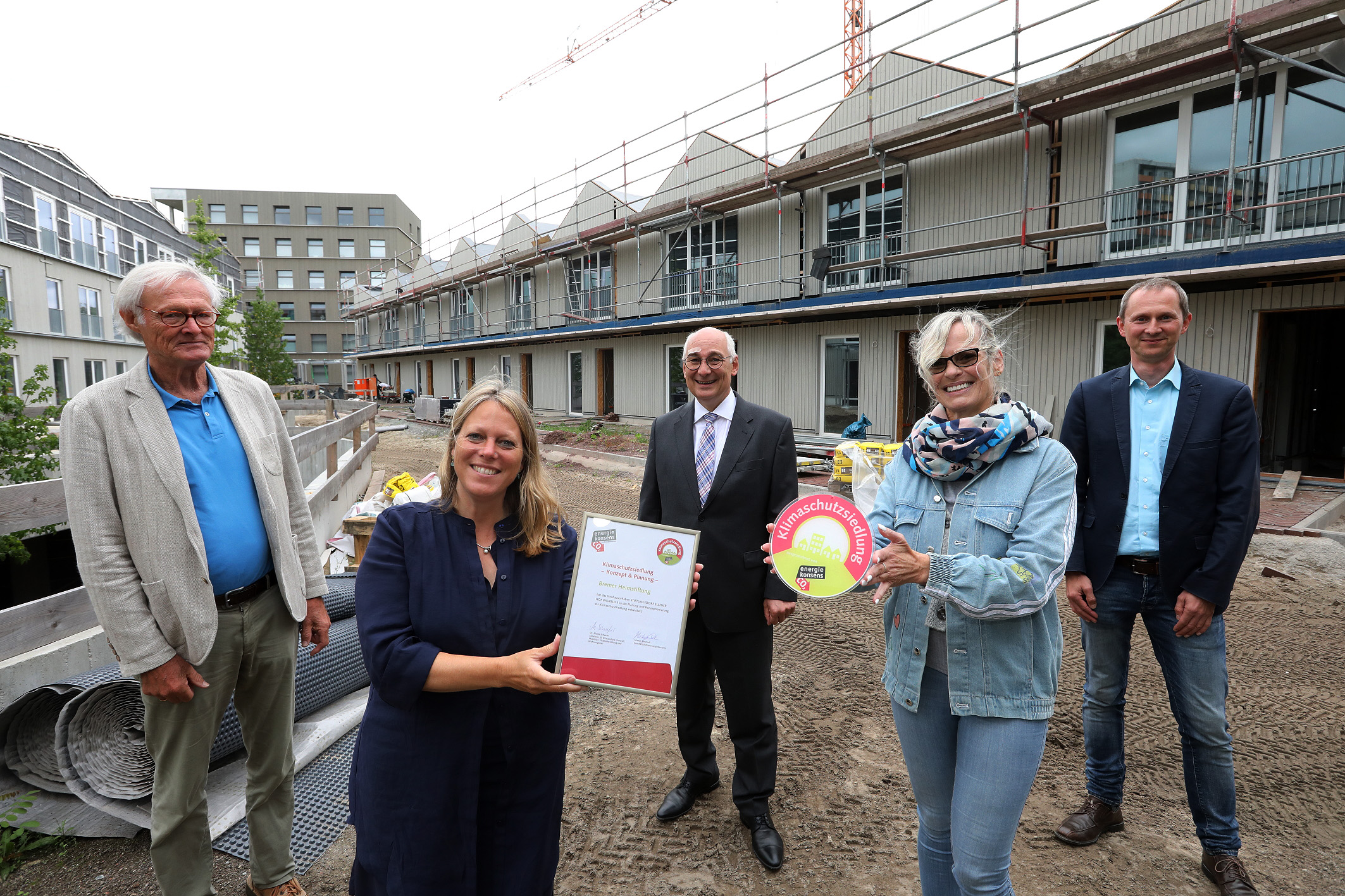 Zum Abschluss ihrer dreitägigen Klimaschutz-Sommertour hat Maike Schaefer, Senatorin für Klimaschutz, Umwelt, Mobilität, Stadtentwicklung und Wohnungsbau das Wohnquartier Ellener Hof als Klimaschutzsiedlung ausgezeichnet. Das Siegel wurde von der Klimaschutzagentur energiekonsens ausgestellt, die das Konzept im Land Bremen geschaffen hat und die Einhaltung der CO2-Grenzwerte überprüft.
