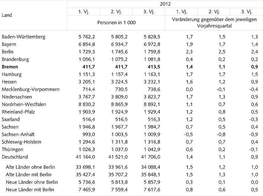 Im Bundesdurchschnitt waren im 3. Quartal 2012 360 000 Personen mehr erwerbstätig als noch im Vorjahresquartal. Die Wachstumsrate lag bei 0,9 Prozent. Die Spannweite bei der Länderentwicklung reichte von +2,4 Prozent in Berlin bis -0,9 Prozent in Sachsen-Anhalt (siehe Tabelle).