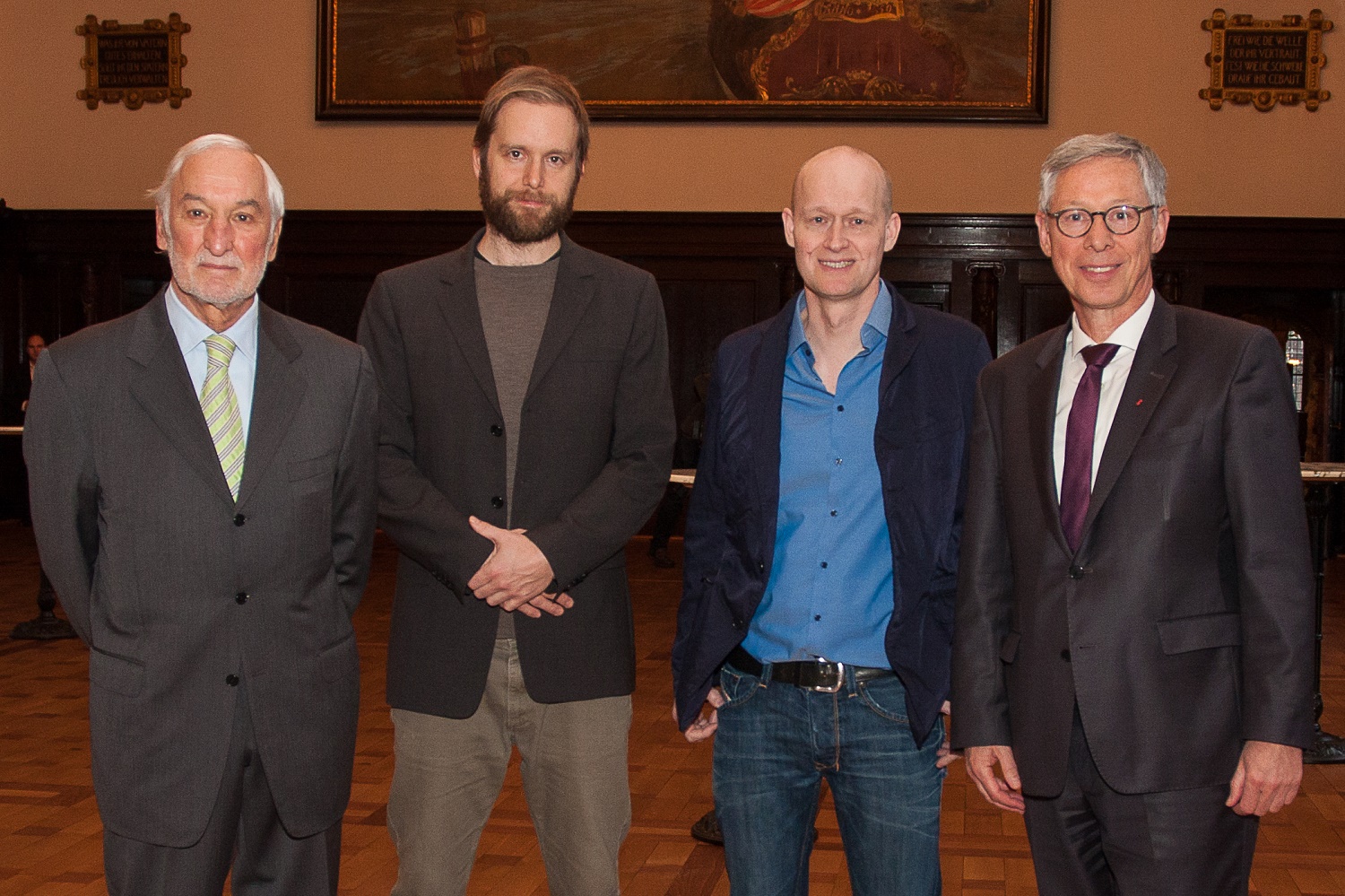 Bürgermeister & Kultursenator Dr. Carsten Sieling mit den beiden Preisträgern Arno Geiger („Unter der Drachenwand“), Heinz Helle („Die Überwindung der Schwerkraft“) und dem Vorsitzenden der Rudolf-Alexander-Schröder-Stiftung, Staatssekretär a.D. Michael Sieber