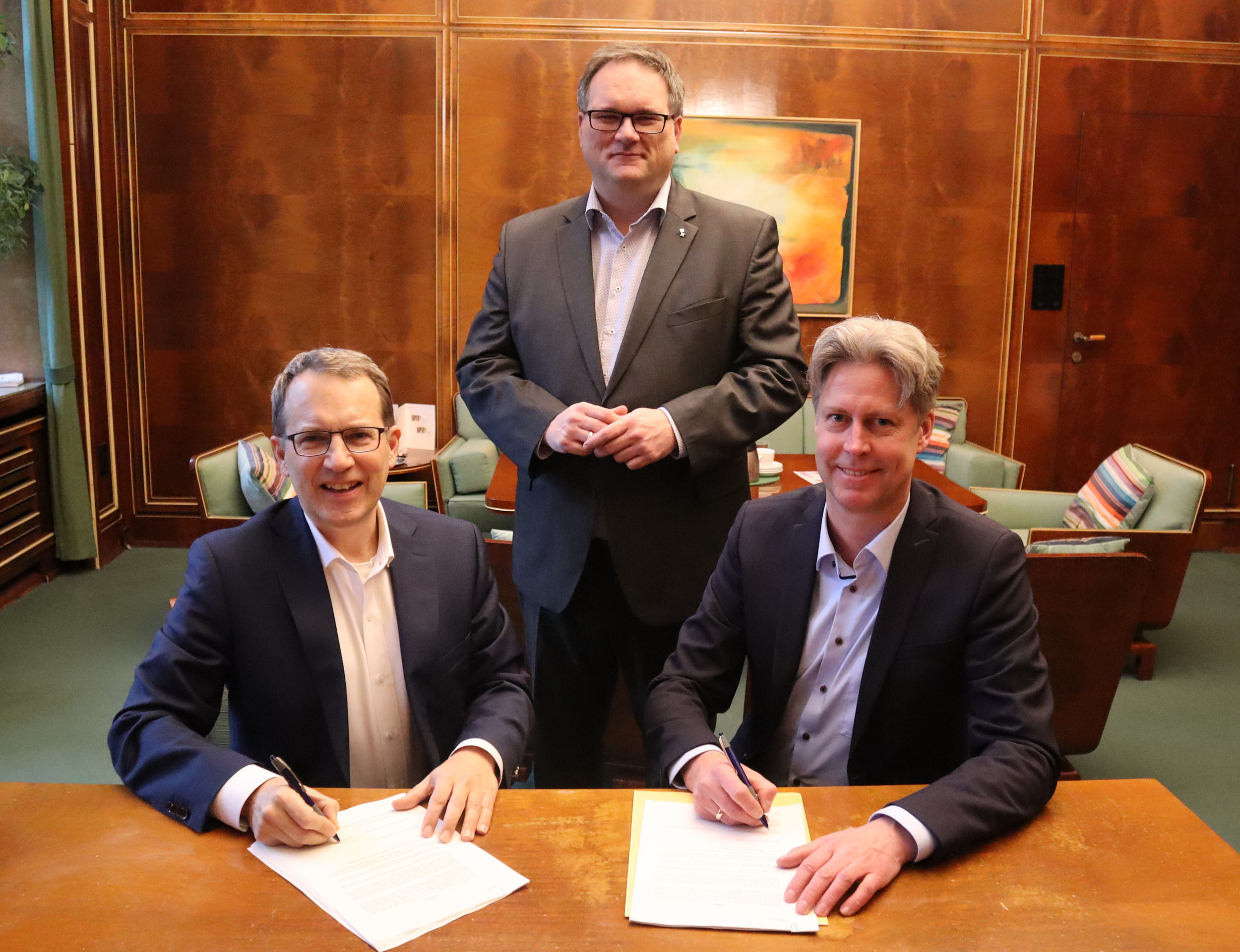 Die Absichtserklärung wurde von Dr. Karsten Schneiker, Vorstandssprecher der swb AG, und Thomas Börsch, Geschäftsführer von Immobilien Bremen, im Beisein von Finanzsenator Björn Fecker unterzeichnet.