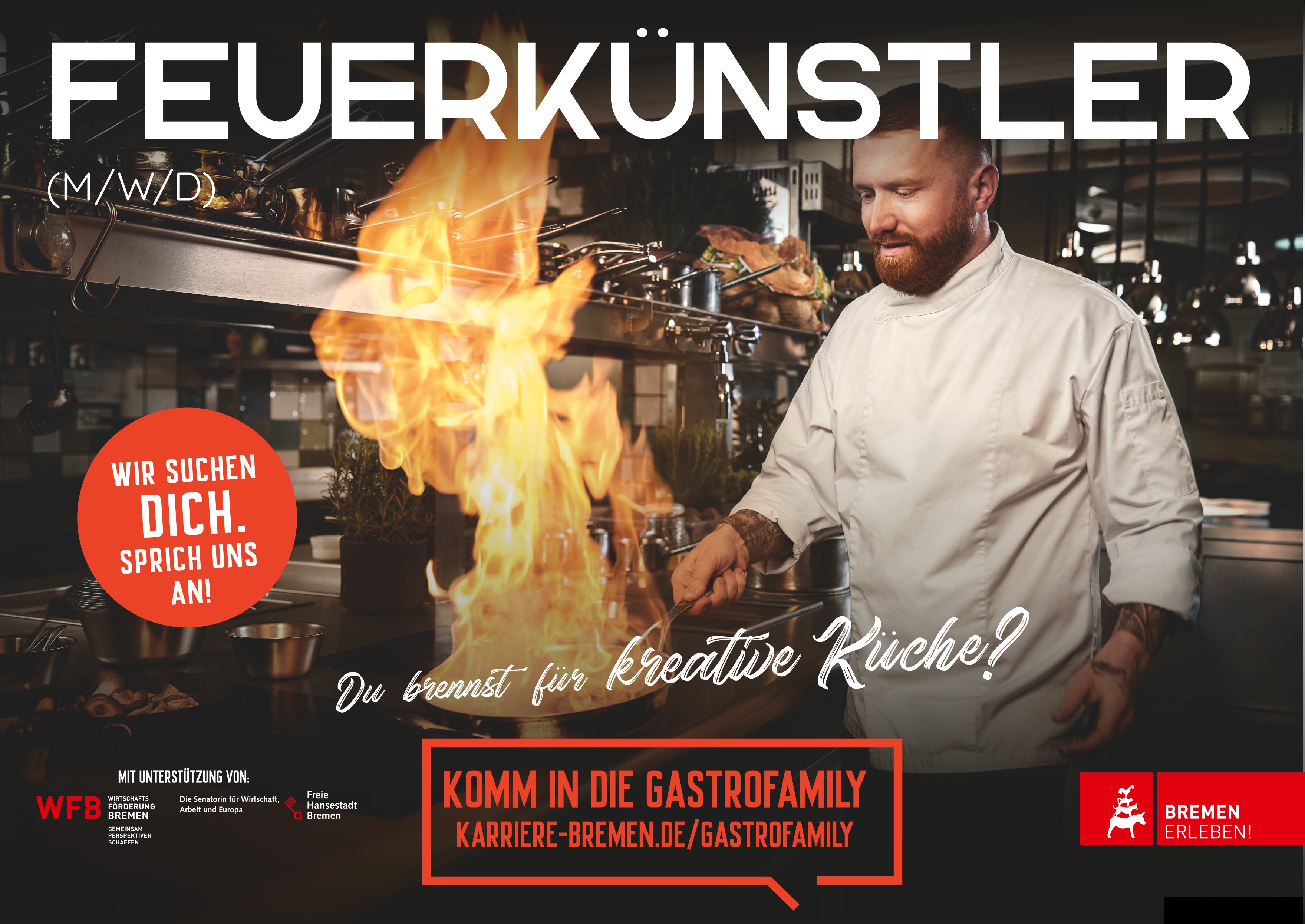 Initiiert durch eine Einladung der senatorischen Behörde entstand im Herbst 2022 eine Arbeitsgruppe aus den Verbänden DEHOGA, Bremer Gastro Gemeinschaft e. V. (BGG), dem Verkehrsverein der Freien Hansestadt Bremen e. V., der WFB Wirtschaftsförderung Bremen GmbH und der Handelskammer. Ziel war es, eine Image-Kampagne für die Gastronomie in Bremen zu lancieren. Die Aktion "Gastrofamily" ist eine bundesweite Fachkräftekampagne, die vom Leaders Club, METRO und Coca Cola ins Leben gerufen wurde. Für Bremen wurden die Plakatmotive angepasst. Die öffentlichkeitswirksame Präsenz auf den Großflächen-Plakaten wird zusätzlich durch eine dreimonatige SocialMedia-Kampagne unter gastrofamily_bremen auf Facebook und Instagram sowie durch Google Ads flankiert. In den Gastronomien gibt es außerdem Bierdeckel, die auf die Kampagne aufmerksam machen. Koordiniert werden die Aktivitäten durch die Bremer Online Marketing Agentur Admospherics. Die WFB ist zuständig für die Schaltung der Großflächen.