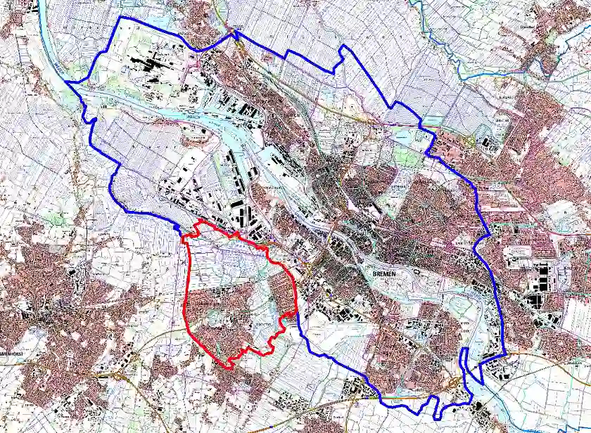 - Im Süden Landesgrenze bis Abfahrt Hemelingen, Autobahnzubringer Hemelingen, Quintstr., Neidenburger Str., Steubenstr, In der Vahr, Bürgermeister-Spitta-Allee, Achternstr., Am Kuhgrabenweg, Hochschulring, Mittelweg, Neue Senkenfahrt, Olafs Wettern, Cluts Wettern, über die Wümme, Blocklander Hemmstr., Waller Str., Graben vor dem Mittelkämpen, Gröpelinger Fleet, an den Piepen, Autobahndreieck Industriehäfen, A 281, Schlekenweg, Klöckner Randgraben, Aukampsgraben bis Landesgrenze.