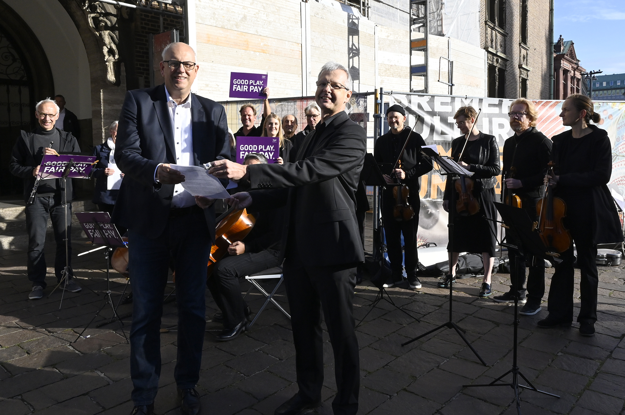 09.09.2022Einen offenen Brief der Deutschen Orchestervereinigung (DOV) mit der Forderung nach fairen Honoraren hat am Freitagvormittag (9. September) vor dem Bremer Rathaus Bürgermeister und Kultursenator Andreas Bovenschulte entgegengenommen. Zuvor hatten dort knapp 20 freischaffende und festangestellte Musikerinnen und Musiker aus der Region eine Fassung des Bach-Chorals "Himmelschreiende Sünde" aus der Markus-Passion aufgeführt. Das Stück war eigens für die bundesweite Kampagne #GoodPlayFairPay (gutes Spiel, faire Bezahlung) arrangiert worden. Die für den 9.9. um 9 Uhr in allen 16 Landeshauptstädten anberaumte Musik-Aktion sollte die prekäre Lage freischaffender Musikerinnen und Musiker und erforderliche Schritte zu einer Verbesserung verdeutlichen.