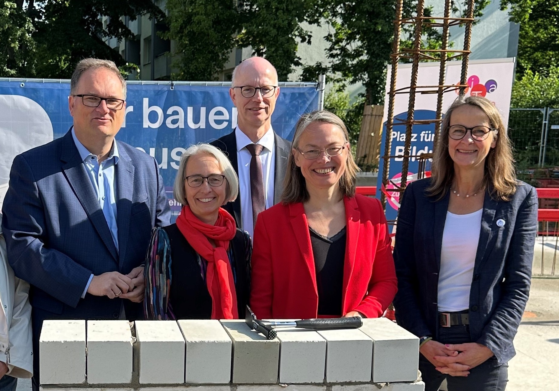 Freuen sich über die Grundsteinlegung für den Bildungscampus Sodenmatt (v.l.): Finanzsenator Björn Fecker, Uta Kummer, Geschäftsführerin von Immobilien Bremen, Uwe Kathmann, Geschäftsführer von KiTa Bremen, Bildungssenatorin Sascha Karolin Aulepp und Schulleiterin Silke Zimmermann. Foto: Finanzressort