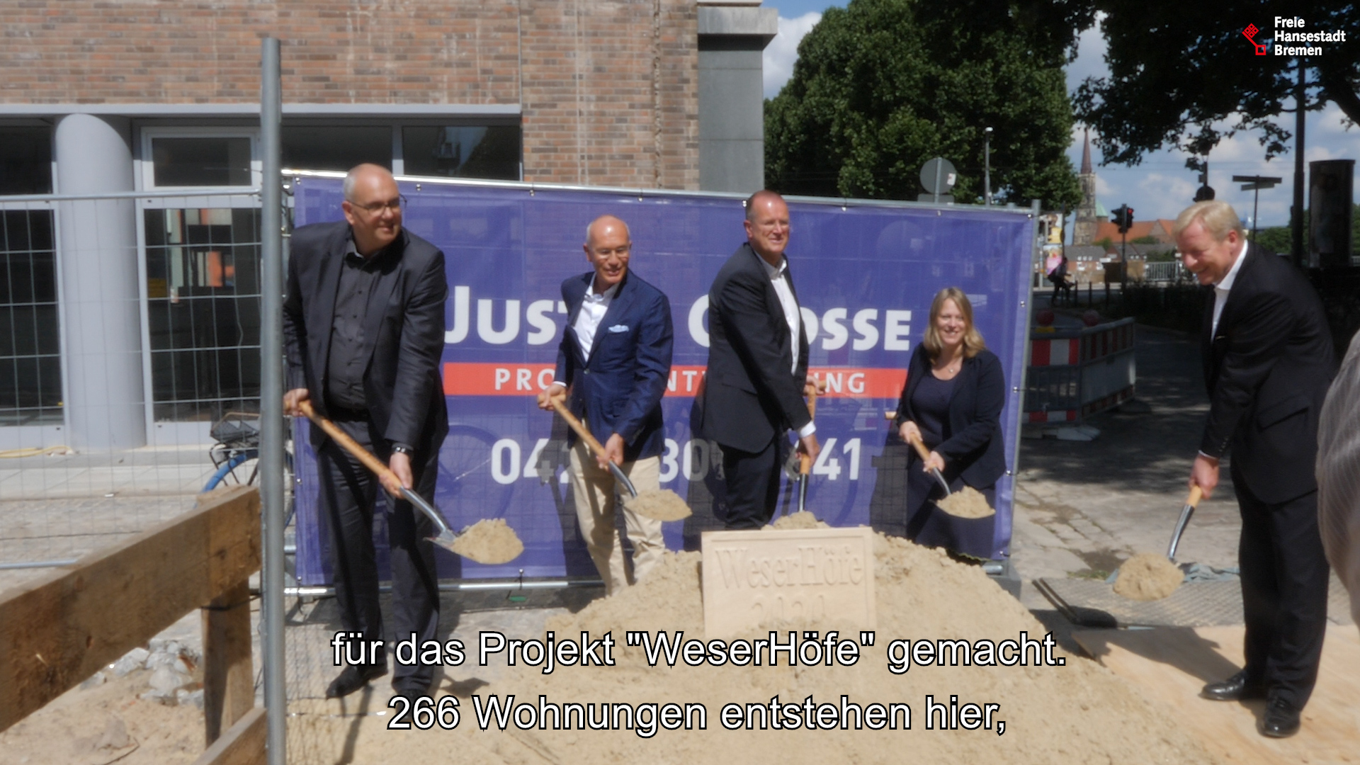 Die Justus Grosse Gesellschafter, Joachim Linnemann und Clemens Paul, freuen sich über den "ersten Spatenstich": "Die zentrale und direkte Lage am Wasser, die hochwertige und offene Architektur sowie die maritime und zugleich urbane Atmosphäre sind für uns sehr reizvoll. Wir freuen uns, mit den "WeserHöfen" einen spannenden Beitrag zur weiteren positiven Entwicklung Bremens zu leisten."
